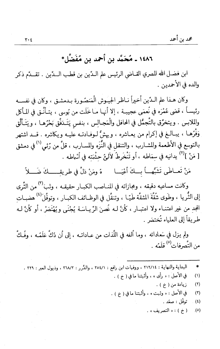 وكانت مساعيه دقيقه، ومجازاته في المناصب الكبار حقيقه، وثب من الثرى إلى الثريا، وطوى شقة المشقة طيا، وتنقل في الوظائف الكبار، وتوقل هضبات المجد من غير اعتناء ولا اعتبار، كأن له غصن الرياسة يجنى ويهتصر، أو كأن له طريقاً إلى العلياء تختصر.