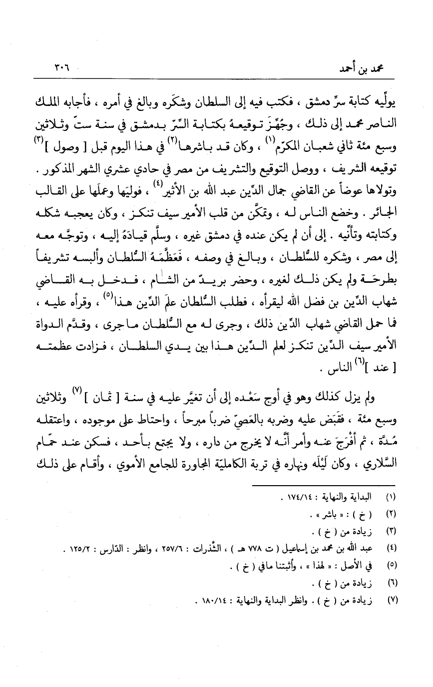 ولم يزل كذلك وهو في أوج سعده إلى أن تغير عليه في سنة ثمان وثلاثين وسبع مئة، فقبض عليه وضربه بالعصي ضرباً مبرحاً، واحتاط على موجوده، واعتقله مدة، ثم أفرج عنه وأمر أنه لا يخرج من داره، ولا يجتمع بأحد، فسكن عند حمام السلاري، وكان ليله ونهاره في تربة الكاملية المجاورة للجامع الأموي، وأقام على ذلك