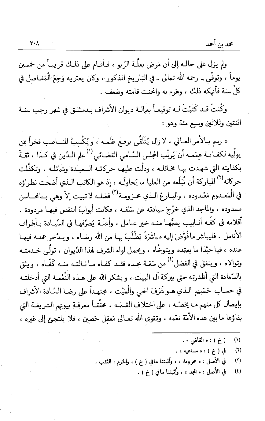 وكنت قد كتبت له توقيعاً بعمالة ديوان الأشراف بدمشق في شهر رجب سنة اثنتين وثلاثين وسبع مئة وهو: " رسم بالأمر العالي، لا زال يتلقى برفع علمه، ويكسب المناصب فخراً بمن يوليه لكفاية هممه أن يرتب المجلس السامي القضائي علم الدين في كذا، ثقةً بكفايته التي شهدت بها مخائله، ودلت عليها حركاته السعيدة وشمائله، وتكفلت حركاته المباركة أن تبلغه من العليا ما يحاوله، إذ هو الكاتب الذي أضحت نظراؤه في المعدوم معدوده، والبارع الذي مخزومة فضله لا تبيت إلا وهي بالمحاسن مسدوده، والماجد الذي خرج سيادته عن سلفه، فكانت أبواب النقص فيها مردودة. أقلامه في كفه أنابيب يضمها منه خير عامل، وأعنة يصرفها في السيادة بأطراف الأنامل. فليباشر ما فوض إليه مباشرةً يطلب بها من الله رضاه، ويدخر عمله فيها عنده، فيا حبذا ما يعتمده ويتوخاه، ويحمل لواء الشرف لهذا الديوان، تولى خدمته وتوالاه، وينفق في الفضل من سعة مجده فقد كفاه ما نالته منه كفاه، ويثق بالسعادة التي أظفرته حتى ببركة آل البيت، ويشكر الله على هذه النعمة التي أدخلته في حساب حسبهم الذي هو شرف الحي والميت، مجتهداً على رضا السادة الأشراف بإيصال كل منهم ما يخصه، على اختلاف القسمة، محققاً معرفة بيوتهم الشريفة التي بقاؤها ما بين هذه الأمة نعمه، وتقوى الله تعالى معقل حصين، فلا يلتجئ إلى غيره،
