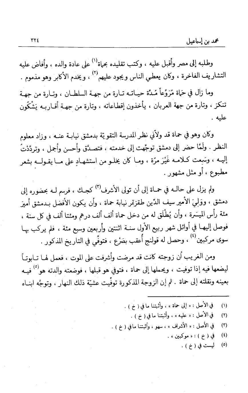 وطلبه إلى مصر وأقبل عليه، وكتب تقليده بحماة على عادة والده، وأفاض عليه التشاريف الفاخرة، وكان يعطي الناس ويجود عليهم، ويخدم الأكابر وهو مذموم.