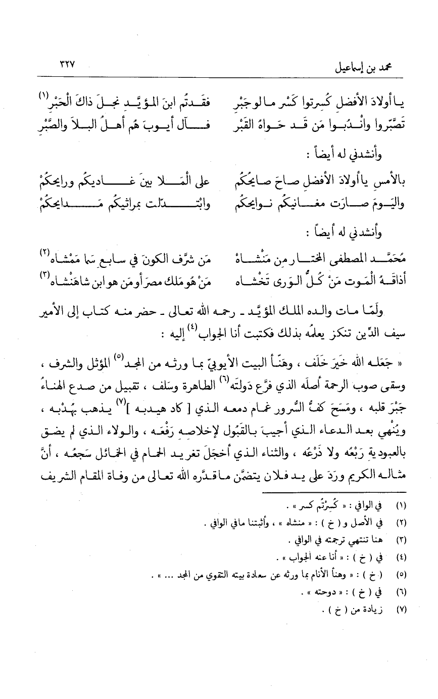 ولما مات والده الملك المؤيد - رحمه الله تعالى - حضر منه كتاب إلى الأمير سيف الدين تنكز يعلمه بذلك فكتبت أنا الجواب إليه: " جعله الله خير خلف، وهنأ البيت الأيوبي بما ورثه من المجد المؤثل والشرف، وسقى صوب الرحمه أصله الذي فرع دولته الطاهرة وسلف، تقبيل من صدع الهناء جبر قلبه، ومسح كف السرور غمام دمعه الذي كاد هيدبه يذهب بهديه، وينهي بعد الدعاء الذي أجيب بالقبول لإخلاصه رفعه، والولاء الذي لم يضق بالعبودية ربعه ولا ذرعه، والثناء الذي أخجل تغريد الحمام في الخمائل سجعه، أن مثاله الكريم ورد على يد فلان يتضمن ما قدره الله تعالى من وفاة المقام الشريف