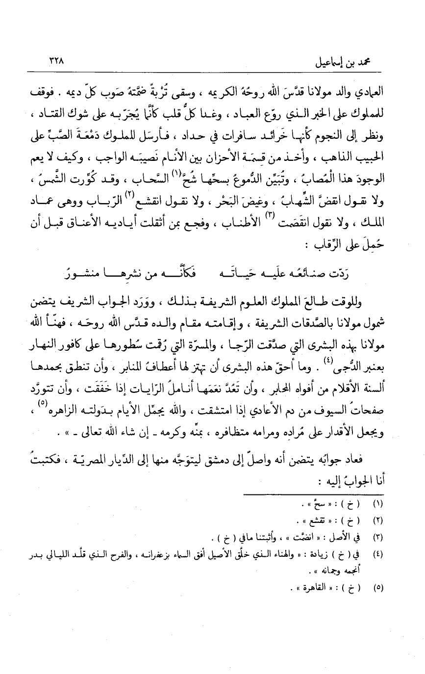 وللوقت طالع المملوك العلوم الشريفة بذلك، وورد الجواب الشريف يتضمن شمول مولانا بالصدقات الشريفة، وإقامته مقام والده قدس الله روحه، فهنأ الله مولانا بهذه البشرى التي صدقت الرجا، والمسرة التي رقمت سطورها على كافور النهار بعنبر الدجى. وما أحق هذه البشرى أن تهتز لها أعطاف المنابر، وأن تنطق بحمدها ألسنة الأقلام من أفواه المحابر، وأن تعد نعمها أنامل الرايات إذا خفقت، وأن تتورد صفحات السيوف من دم الأعادي إذا امتشقت، والله يجمل الأيام بدولته الزاهره، ويجعل الأقدار على مراده ومرامه متظافره، بمنه وكرمه - إن شاء الله تعالى - ".