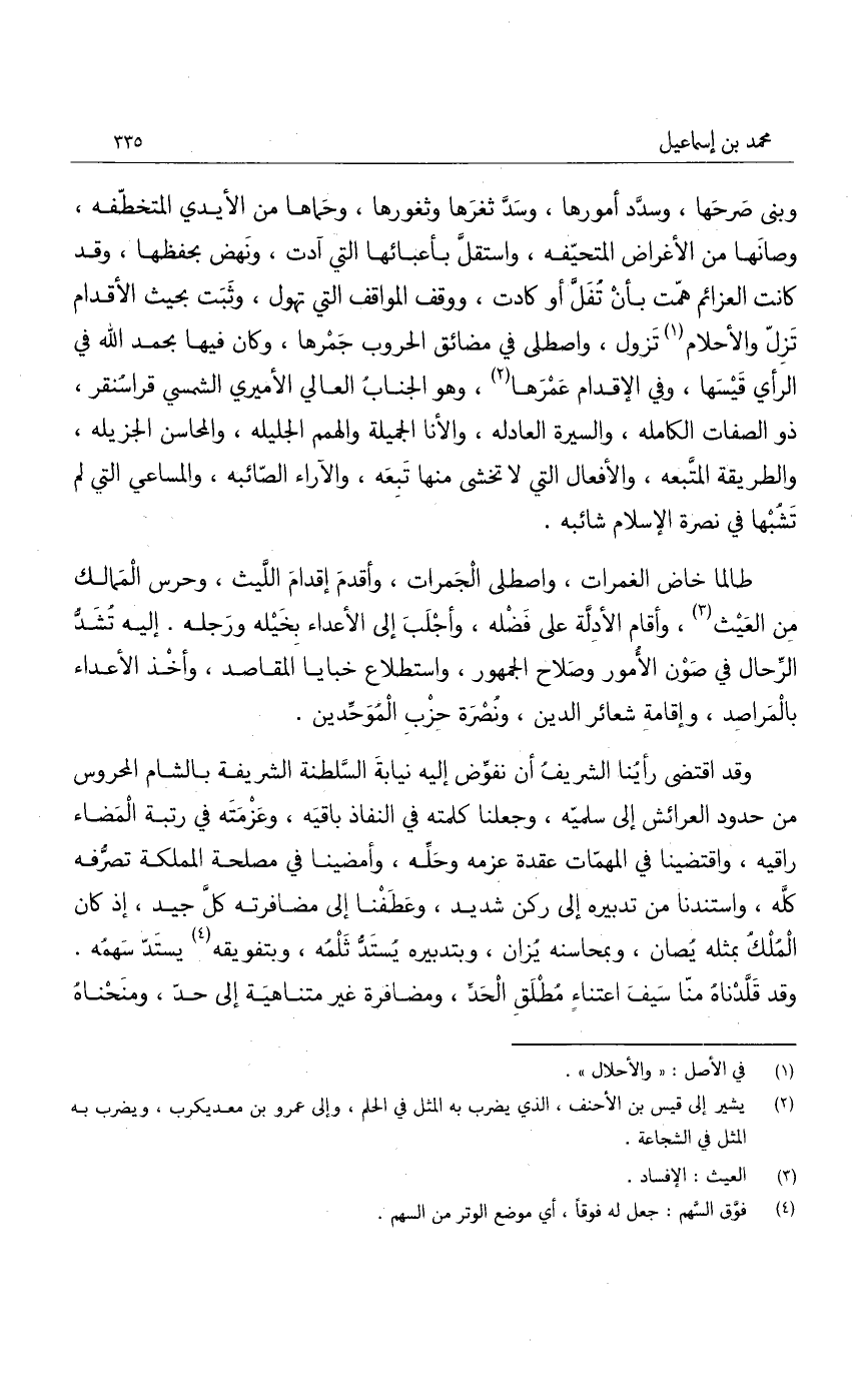 وبنى صرحها، وسدد أمورها، وسد ثغرها وثغورها، وحماها من الأيدي المتخطفه، وصانها من الأغراض المتحيفه، واستقل بأعبائها التي آدت، ونهض بحفظها، وقد كانت العزائم همت بأن تفل أو كادت، ووقف المواقف التي تهول، وثبت بحيث الأقدام تزل والأحلام تزول، واصطلى في مضائق الحروب جمرها، وكان فيها بحمد الله في الرأي قيسها، وفي الإقدام عمرها، وهو الجناب العالي الأميري الشمسي قراسنقر، ذو الصفات الكامله، والسيرة العادله، والأنا الجميلة والهمم الجليله، والمحاسن الجزيله، والطريقة المتبعه، والأفعال التي لا تخشى منها تبعه، والآراء الصائبه، والمساعي التي لم تشبها في نصرة الإسلام شائبه.