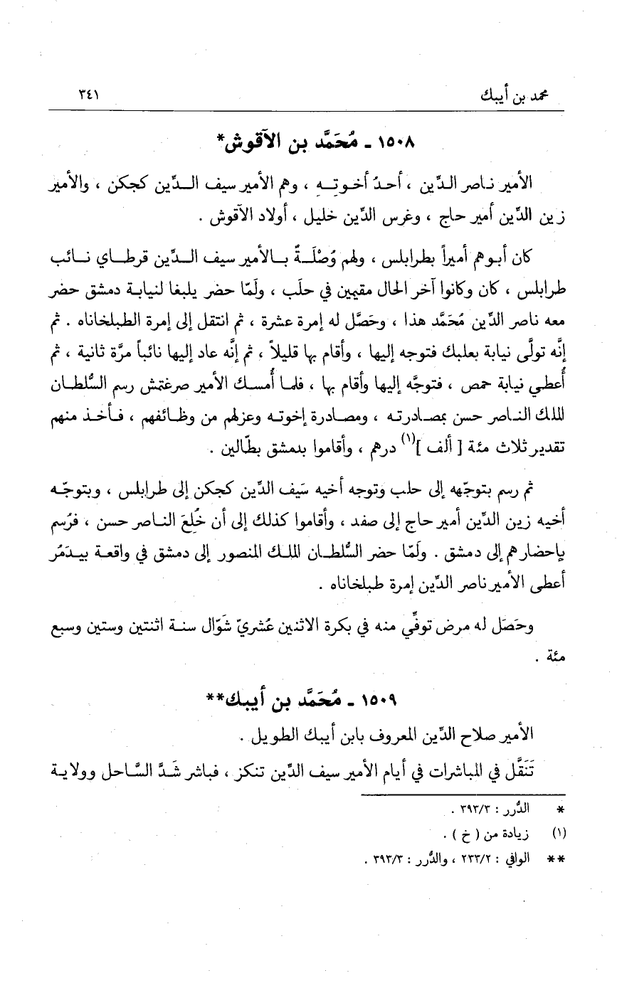 كان أبوهم أميراً بطرابلس، ولهم وصلة بالأمير سيف الدين قرطاي نائب طرابلس، كان وكانوا آخر الحال مقيمين في حلب، ولما حضر لنيابة دمشق حضر معه ناصر الدين محمد هذا، وحصل له إمرة عشرة، ثم انتقل إلى إمرة الطبلخاناه. ثم إنه تولى نيابة بعلبك فتوجه إليها، وأقام بها قليلاً، ثم إنه عاد إليها نائباً مرة ثانية، ثم أعطي نيابة حمص، فتوجه إليها وأقام بها، فلما أمسك الأمير صرغتمش رسم السلطان الملك الناصر حسن بمصادرته، ومصادرة إخوته وعزلهم من وظائفهم، فأخذ منهم تقدير ثلاث مئة ألف درهم، وأقاموا بدمشق بطالين.