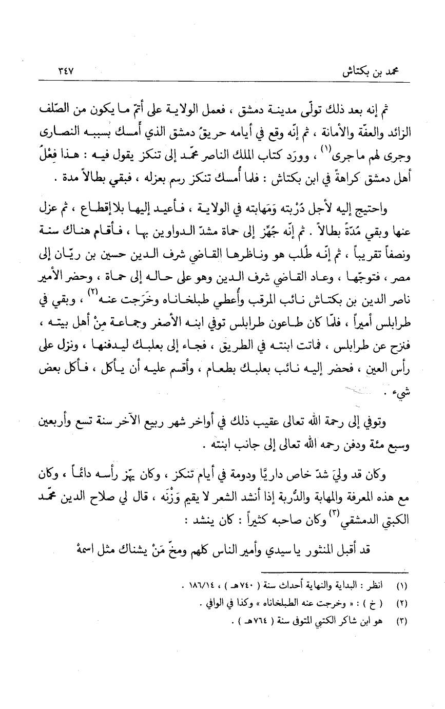 واحتيج إليه لأجل دربته ومهابته في الولاية، فأعيد إليها بلا انقطاع، ثم عزل عنها وبقي مدةً بطالاً. ثم إنه جهز إلى حماة مشد الدواوين بها، فأقام هناك سنة ونصفاً تقريباً، ثم إنه طلب هو وناظرها القاضي شرف الدين حسين بن ريان إلى مصر، فتوجها، وعاد القاضي شرف الدين وهو على حاله إلى حماة، وحضر الأمير ناصر الدين بن بكتاش نائب المرقب وأعطي طبلخاناه وخرجت عنه، وبقي في طرابلس أميراً، فلما كان طاعون طرابلس توفي ابنه الأصغر وجماعة من أهل بيته، فنزح عن طرابلس، فماتت ابنته في الطريق، فجاء إلى بعلبك ليدفنها، ونزل على رأس العين، فحضر إليه نائب بعلبك بطعام، وأقسم عليه أن يأكل، فأكل بعض شيء.