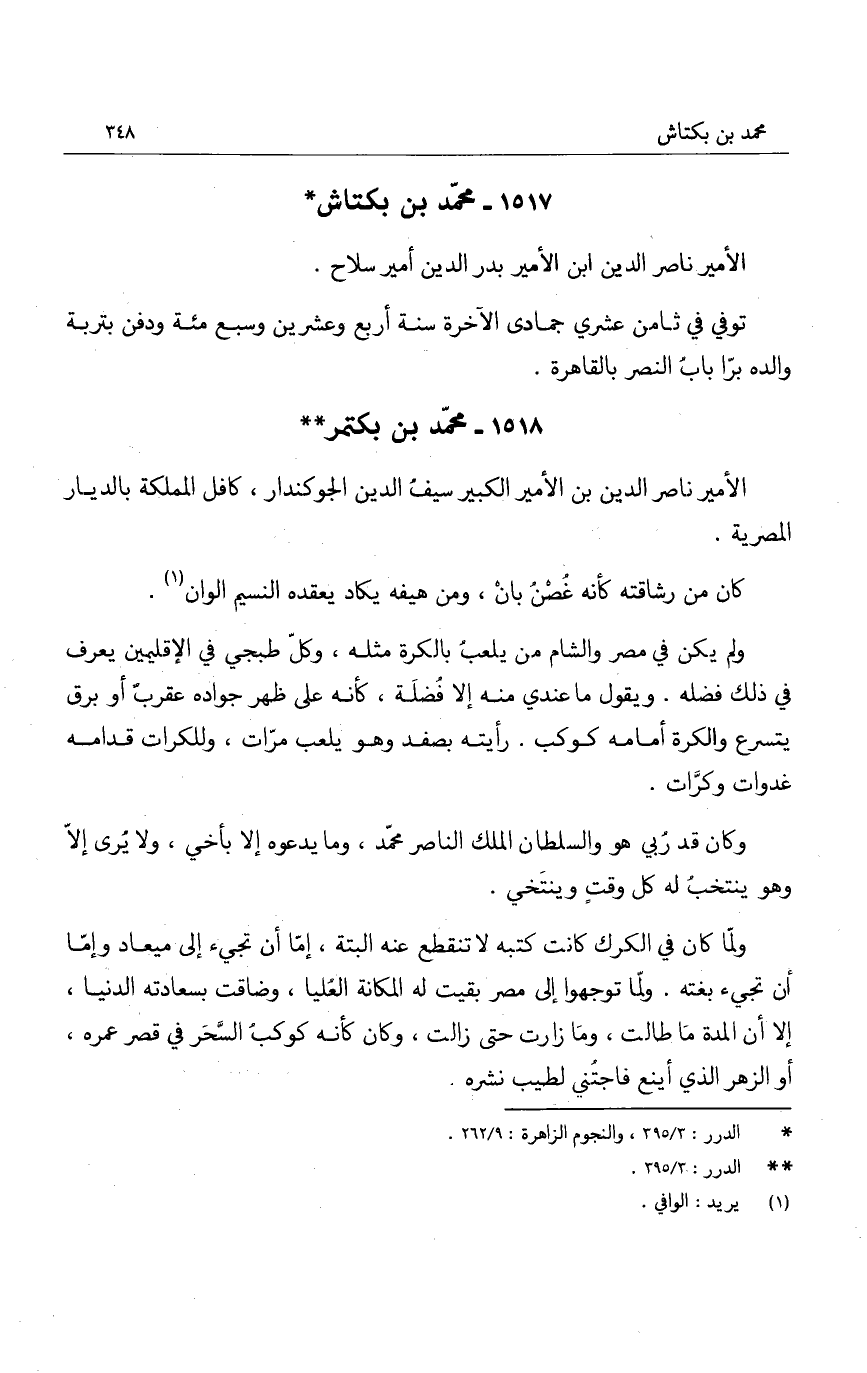 ولم يكن في مصر والشام من يلعب بالكرة مثله، وكل طبجي في الإثليمين يعرف في ذلك فضله. ويقول ما عندي منه إلا فضله، كأنه على ظهر جواده عقرب أبو برق يتسرع والكرة أمامه كوكب. رأيته بصفد وهو يلعب مرات، وللكرات قدامه غدوات وكرات.