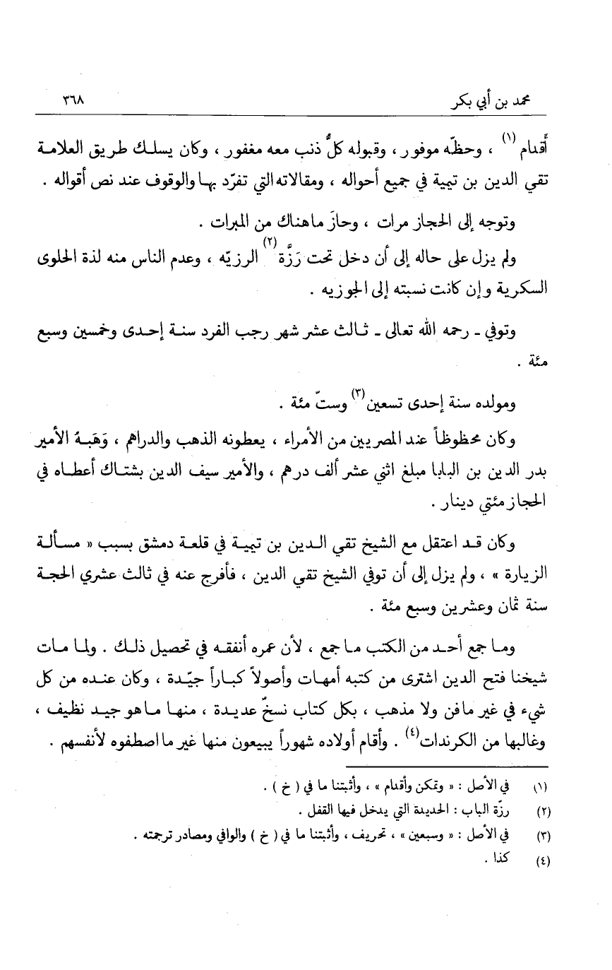 أقدام، وحظه موفور، وقبوله كل ذنب معه مغفور، وكان يسلك طريق العلامة تقي الدين بن تيمية في جميع أحواله، ومقالاته التي تفرد بها والوقوف عند نص أقواله.