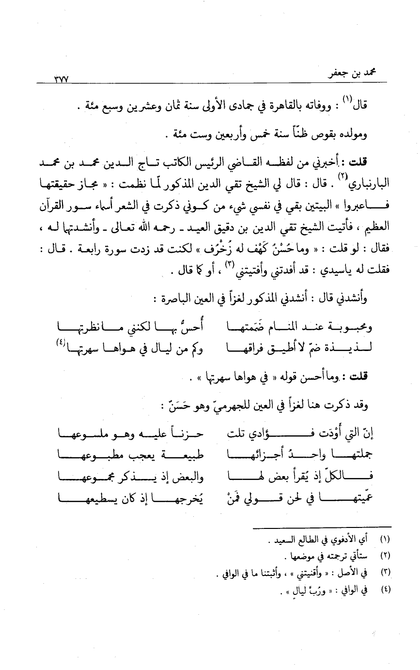 قلت: أخبرني من لفظه القاضي الرئيس الكاتب تاج الدين محمد بن محمد البارنباري. قال: قال لي الشيخ تقي الدين المذكور لما نظمت: " مجاز حقيقتها فاعبروا " البيتين بقي في نفسي شيء من كوني ذكرت في الشعر أسماء سور القرآن العظيم، فأتيت الشيخ تقي الدين بن دقيق العيد - رحمه الله تعالى - وأنشدتهما له، فقال: لو قلت: " وما حسن كهف له زخرف " لكنت قد زدت سورة رابعة. قال: فقلت له يا سيدي: قد أفدتني وأفتيتني، أو كما قال.