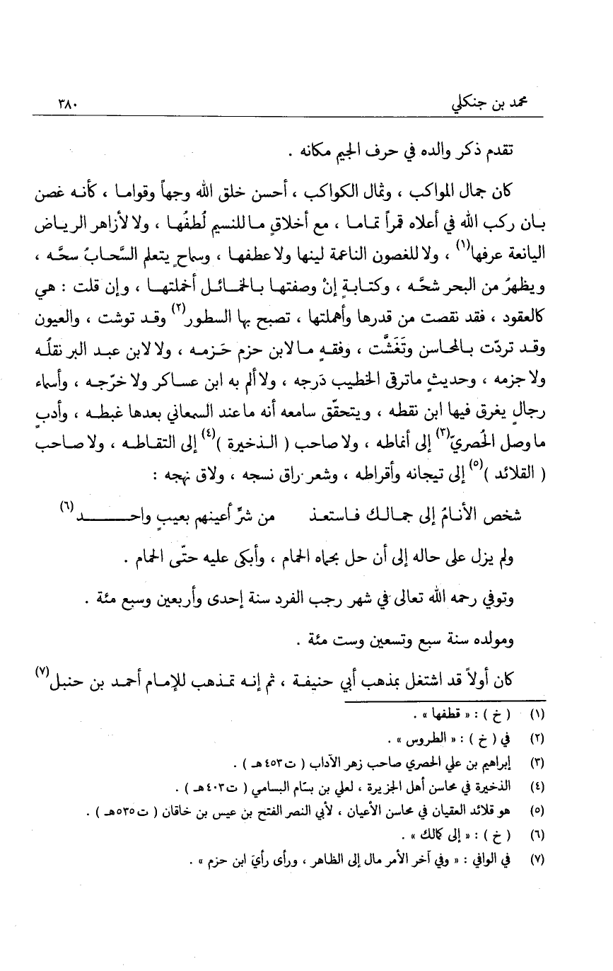 كان جمال المواكب، وثمال الكواكب، أحسن خلق الله وجهاً وقواما، كأنه غصن بان ركب الله في أعلاه قمراً تماما، مع أخلاق ما للنسيم لطفها، ولا لأزاهر الرياض اليانعة عرفها، ولا للغصون الناعمة لينها ولا عطفها، وسماح يتعلم السحاب سحه، ويظهر من البحر شحه، وكتابة إن وصفتها بالخمائل أخملتها، وإن قلت: هي كالعقود، فقد نقصت من قدرها وأهملتها، تصبح بها السطور وقد توشت، والعيون وقد تردت بالمحاسن وتغشت، وفقه ما لابن حزم حزمه، ولا لابن عبد البر نقله ولا جزمه، وحديث ما ترقى الخطيب درجه، ولا ألم به ابن عساكر ولا خرجه، وأسماء رجال يغرق فيها ابن نقطه، ويتحقق سامعه أنه ما عند السمعاني بعدها غبطه، وأدب ما وصل الحصري إلى أنماطه، ولا صاحب " الذخيرة " إلى التقاطه، ولا صاحب " القلائد " إلى تيجانه وأقراطه، وشعر راق نسجه، ولاق نهجه: