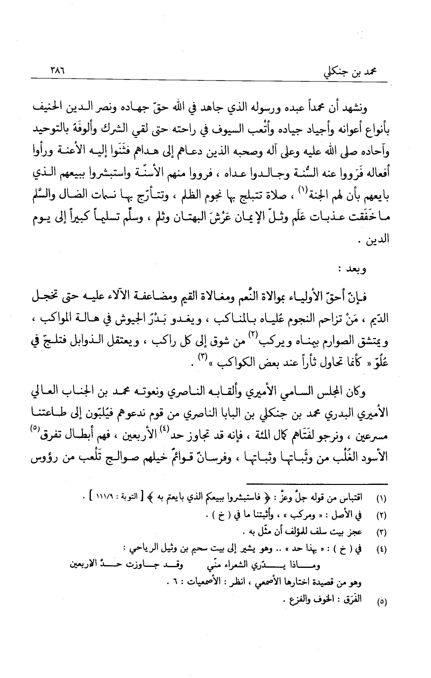 ونشهد أن محمداً عبده ورسوله الذي جاهد في الله حق جهاده ونصر الدين الحنيف بأنواع أعوانه وأجياد جياده وأتعب السيوف في راحته حتى لقي الشرك وألوفه بالتوحيد وآحاده صلى الله عليه وعلى آله وصحبه الذين دعاهم إلى هداهم فثنوا إليه الأعنة ورأوا أفعاله فرووا عنه السنة وجالدوا عداه، فرووا منهم الأسنة واستبشروا ببيعهم الذي بايعهم بأن لهم الجنة، صلاة تتبلج بها نجوم الظلم، وتتأرج بها نسمات الضال والسلم ما خفقت عذبات علم وثل الإيمان عرش البهتان وثلم، وسلم تسليماً كبيراً إلى يوم الدين.