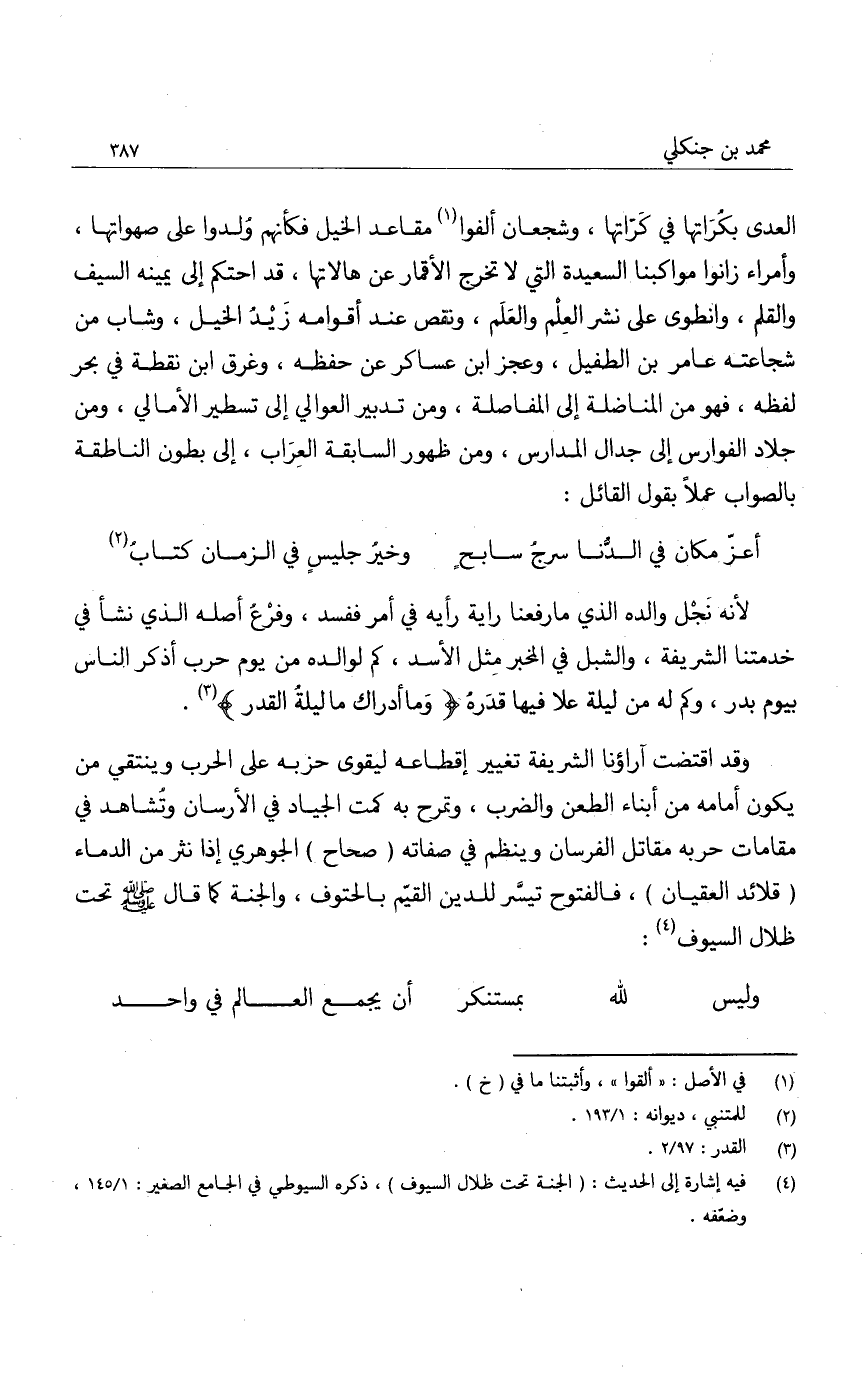 العدى بكراتها في كراتها، وشجعان ألفوا مقاعد الخيل فكأنهم ولدوا على صهواتها، وأمراء زانوا مواكبنا السعيدة التي لا تخرج الأقمار عن هالاتها، قد احتكم إلى يمينه السيف والقلم، وانطوى على نشر العلم والعلم، ونقص عند أقوامه زيد الخيل، وشاب من شجاعته عامر بن الطفيل، وعجز ابن عساكر عن حفظه، وغرق ابن نقطة في بحر لفظه، فهو من المناضلة إلى المفاصلة، ومن تدبير العوالي إلى تسطير الأمالي، ومن جلاد الفوارس إلى جدال المدارس، ومن ظهور السابقة العراب، إلى بطون الناطقة بالصواب عملاً بقول القائل: