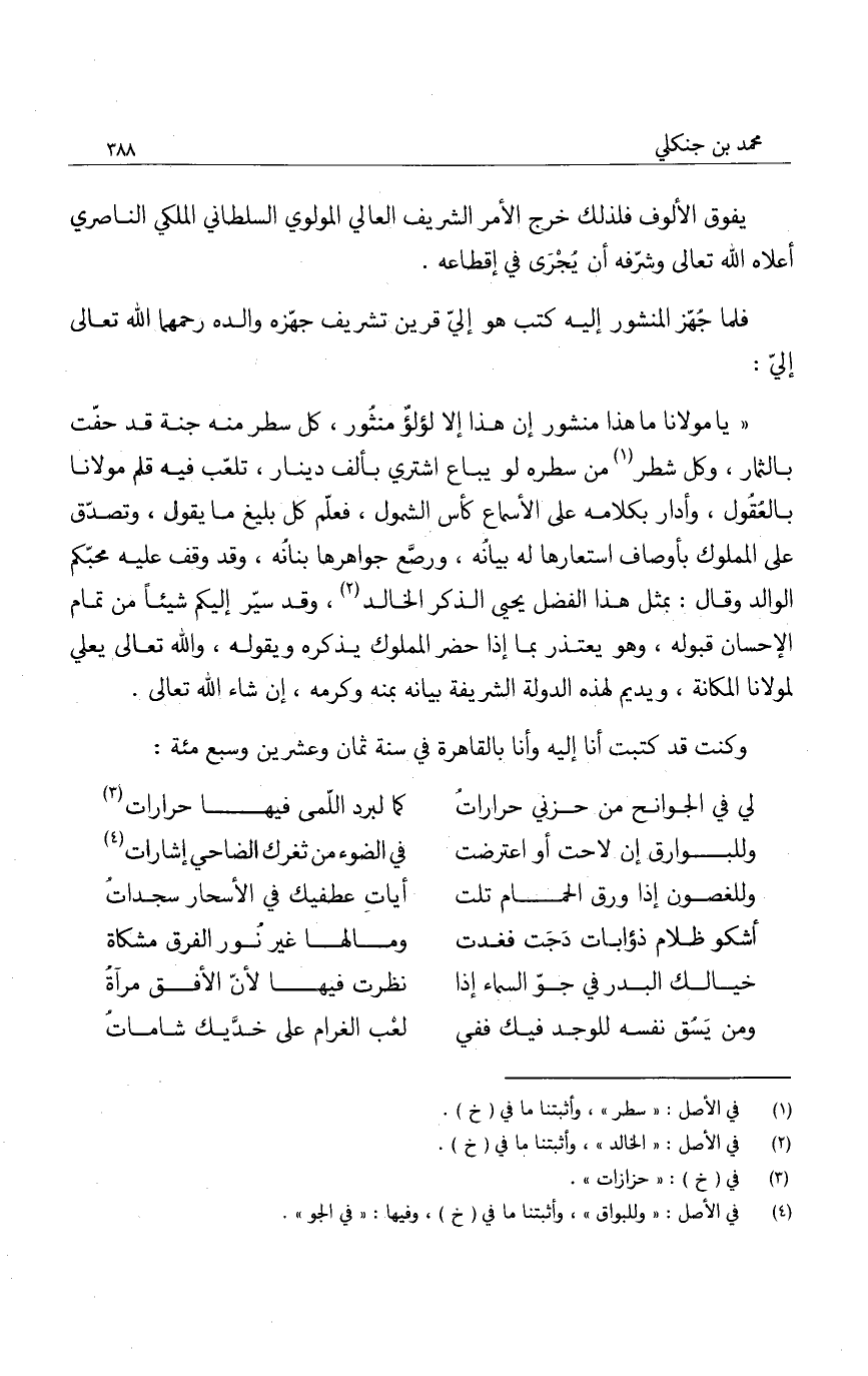 فلما جهز المنشور إليه كتب هو إلي قرين تشريف جهزه والده رحمهما الله تعالى إلي: " يا مولانا ما هذا منشور إن هذا إلا لؤلؤ منثور، كل سطر منه جنة قد حفت بالثمار، وكل شطر من سطره لو يباع اشتري بألف دينار، تلعب فيه قلم مولانا بالعقول، وأدار بكلامه على الأسماع كأس الشمول، فعلم كل بليغ ما يقول، وتصدق على المملوك بأوصاف استعارها له بيانه، ورصع جواهرها بنانه، وقد وقف عليه محبكم الوالد وقال: بمثل هذا الفضل يحيى الذكر الخالد، وقد سير إليكم شيئاً من تمام الإحسان قبوله، وهو يعتذر بما إذا حضر المملوك يذكره ويقوله، والله تعالى يعلي لمولانا المكانة، ويديم لهذه الدولة الشريفة بيانه بمنه وكرمه، إن شاء الله تعالى.