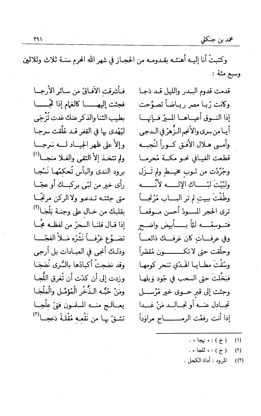 وكتبت أنا إليه أهنئه بقدومه من الحجاز في شهر الله المحرم سنة ثلاث وثلاثين وسبع مئة: