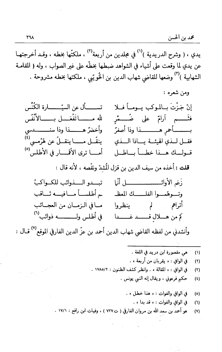 يدي، " وشرح الدريدية " في مجلدين من أربعة، ملكتها بخطه، وقد أخرجتها عن يدي لما وقعت على أشياء في الشواهد ضبطها بخطه على غير الصواب، وله " المقامة الشهابية " وضعها للقاضي شهاب الدين بن الخويبي، ملكتها بخطه مشروحة.