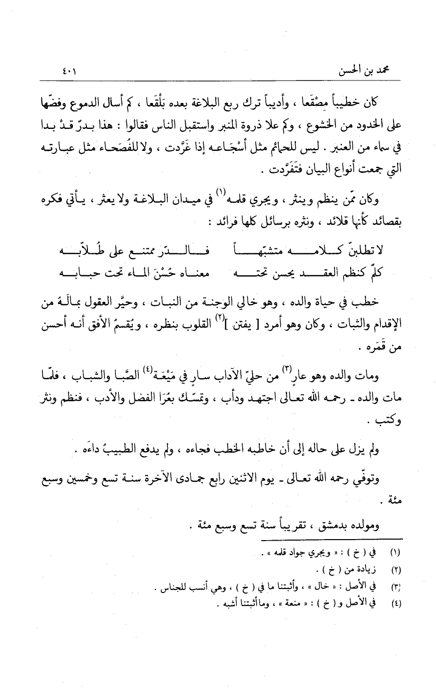 كان خطيباً مصقعا، وأديباً ترك ربع البلاغة بعده بلقعا، كم أسال الدموع وفضها على الخدود من الخشوع، وكم علا ذروة المنبر واستقبل الناس فقالوا: هذا بدر قد بدا في سماء من العنبر. ليس للحمائم مثل أسجاعه إذا غردت، ولا للفصحاء مثل عبارته التي جمعت أنواع البيان فتفردت.