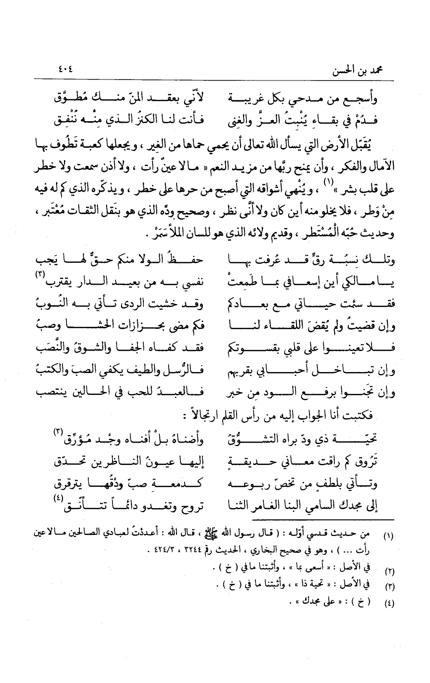 يقبل الأرض التي يسأل الله تعالى أن يحمي حماها من الغير، ويجعلها كعبة تطوف بها الآمال والفكر، وأن يمنح ربها من مزيد النعم ما لا عين رأت، ولا أذن سمعت ولا خطر على قلب بشر، وينهي أشواقه التي أصبح من حرها على خطر، ويذكره الذي كم له فيه من وطر، فلا يخلو منه أين كان ولا أنى نظر، وصحيح وده الذي هو بنقل الثقات معتبر، وحديث حبه المستطر، وقديم ولائه الذي هو للسان الملأ سمر.