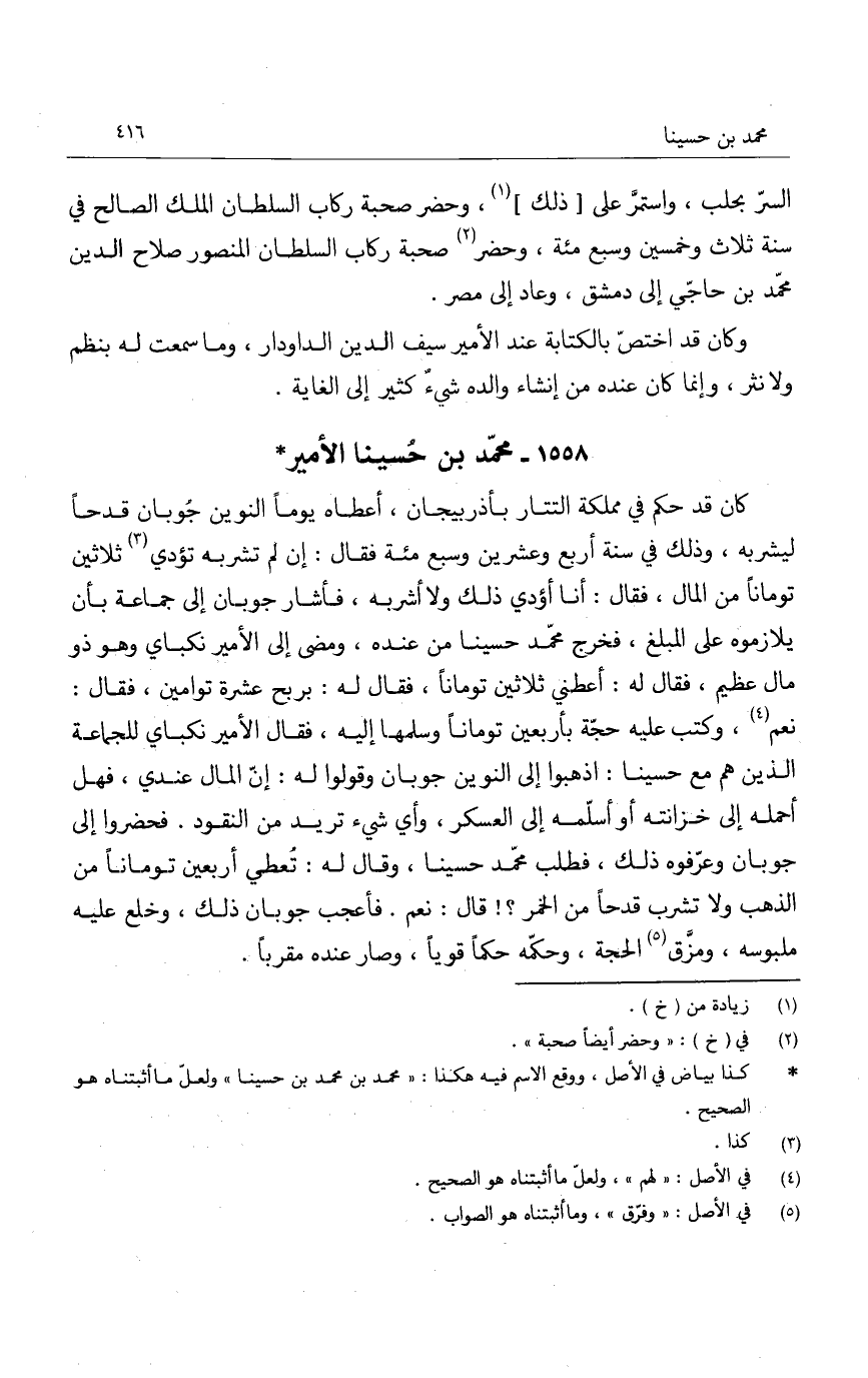 كان قد حكم في مملكة التتار بأذربيجان، أعطاه يوماً النوين جوبان قدحاً ليشربه، وذلك في سنة أربع وعشرين وسبع مئة فقال: إن لم تشربه تؤدي ثلاثين توماناً من المال، فقال: أنا أؤدي ذلك ولا أشربه، فأشار جوبان إلى جماعة بأن يلازموه على المبلغ، فخرج محمد حسينا من عنده، ومضى إلى الأمير نكباي وهو ذو مال عظيم، فقال له: أعطني ثلاثين توماناً، فقال له: بربح عشرة توامين، فقال: نعم، وكتب عليه حجة بأربعين توماناً وسلمها إليها، فقال الأمير نكباي للجماعة الذين هم مع حسينا: اذهبوا إلى النوين جوبان وقولوا له: إن المال عندي، فهل أحمله إلى خزانته أو أسلمه إلى العسكر، وأي شيء تريد من النقود. فحضروا إلى جوبان وعرفوه ذلك، فطلب محمد حسينا، وقال له: تعطي أربعين توماناً من الذهب ولا تشرب قدحاً من الخمر؟! قال: نعم. فأعجب جوبان ذلك، وخلع عليه ملبوسه، ومزق الحجة، وحكمه حكماً قوياً، وصار عنده مقرباً.