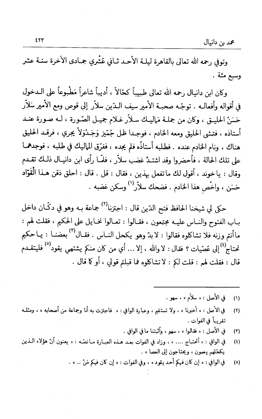 وكان ابن دانيال رحمه الله تعالى طبيباً كحالاً، أديباً شاعراً مطبوعاً على الدخول في أقواله وأفعاله. توجه صحبة الأمير سيف الدين سلار إلى قوص ومع الأمير سلار حسن الحليق، وكان من جملة مماليك سلار غلام جميل الصورة، له صورة عند أستاذه، فتمشى الحليق ومعه الخادم، فوجدا ظل جميز وجدولاً يجري، فرقد الحليق هناك، ونام الخادم عنده، فطلبه أستاذه فلم يجده، ففرق المماليك في طلبه، فوجدهما على تلك الحالة، فأحضروا وقد اشتد غضب سلار، فلما رأى ابن دانيال ذلك تقدم وقال: يا خوند، أقول لك ما تفعل بهذين، فقال: قل. قال: احلق ذقن هذا القواد حسن، واخص هذا الخادم. فضحك سلار وسكن غضبه.
