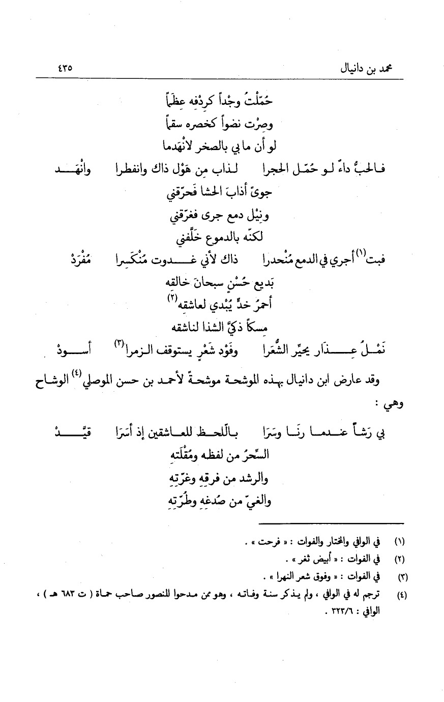 وقد عارض ابن دانيال بهذه الموشحة موشحة لأحمد بن حسن الموصلي الوشاح وهي: