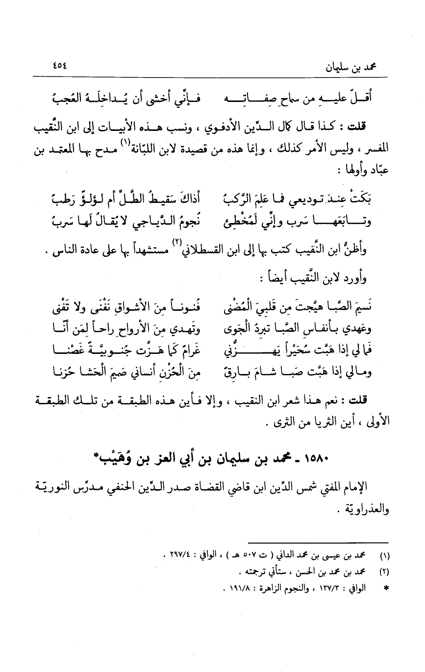 قلت: نعم هذا شعر ابن النقيب، وإلا فأين هذه الطبقة من تلك الطبقة الأولى، أين الثريا من الثرى.