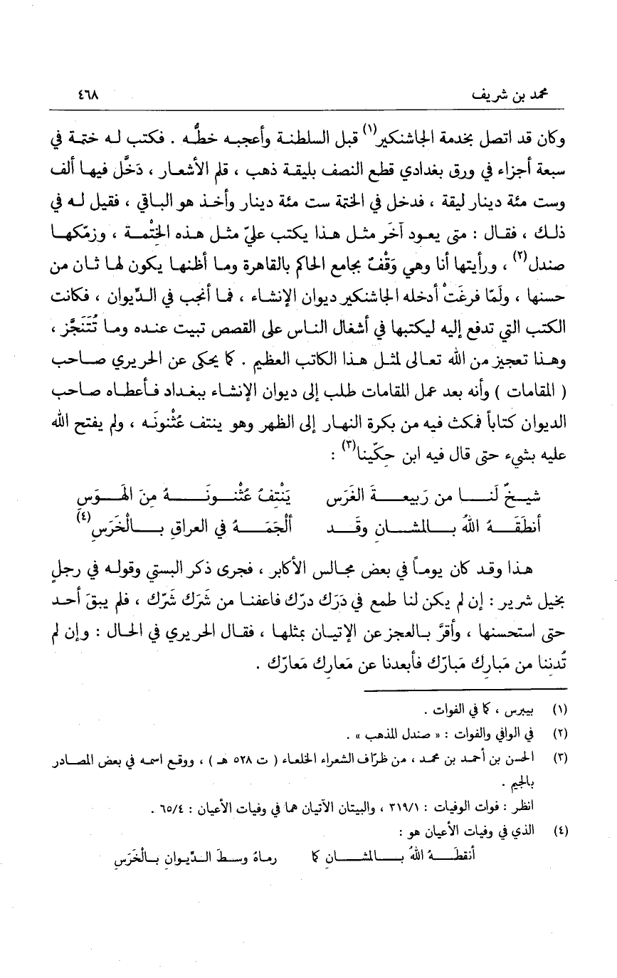 هذا وقد كان يوماً في بعض مجالس الأكابر، فجرى ذكر البستي وقوله في رجل بخيل شرير: إن لم يكن لنا طمع في درك فاعفنا من شرك شرك، فلم يبق أحد حتى استحسنها، وأقر بالعجز عن الإتيان بمثلها، فقال الحريري في الحال: وإن لم تدننا من مبارك فأبعدنا عن معارك معارك.
