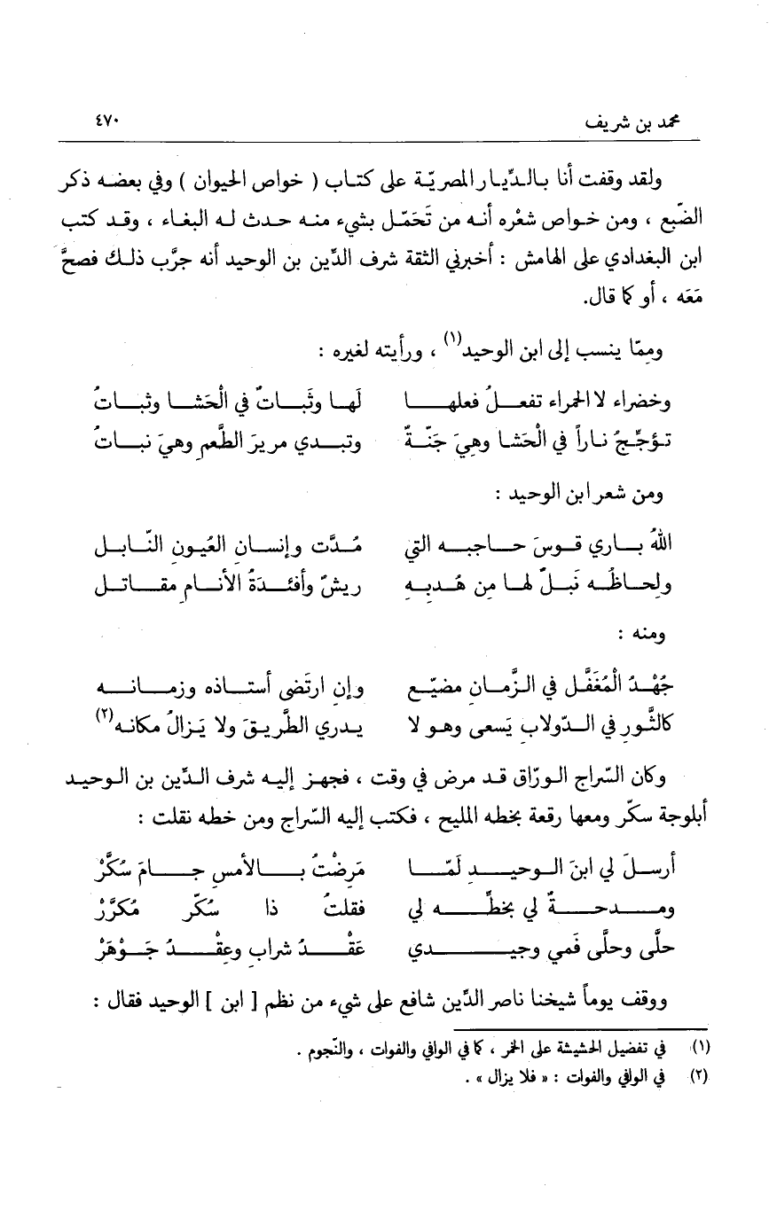 ووقف يوماً شيخنا ناصر الدين شافع على شيء من نظم ابن الوحيد فقال: