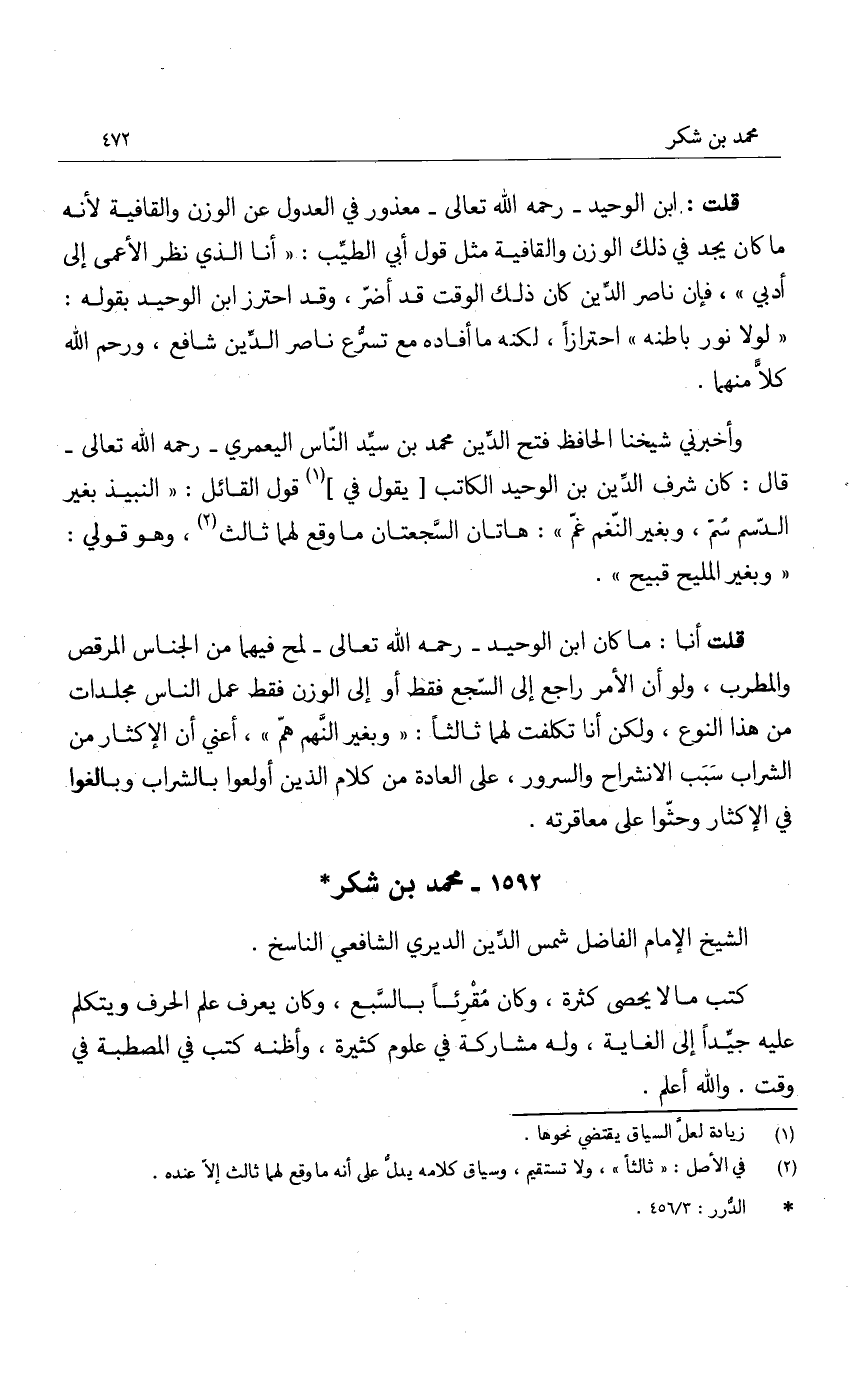 قلت: ابن الوحيد - رحمه الله تعالى - معذور في العدول عن الوزن والقافية لأنه ما كان يجد في ذلك الوزن والقافية مثل قول أبي الطيب: أنا الذي نظر الأعمى إلى أدبي، فإن ناصر الدين كان ذلك الوقت قد أضر، وقد احترز ابن الوحيد بقوله: " لولا نور باطنه " احترازاً، لكنه ما أفاده مع تسرع ناصر الدين شافع، ورحم الله كلا منهما.