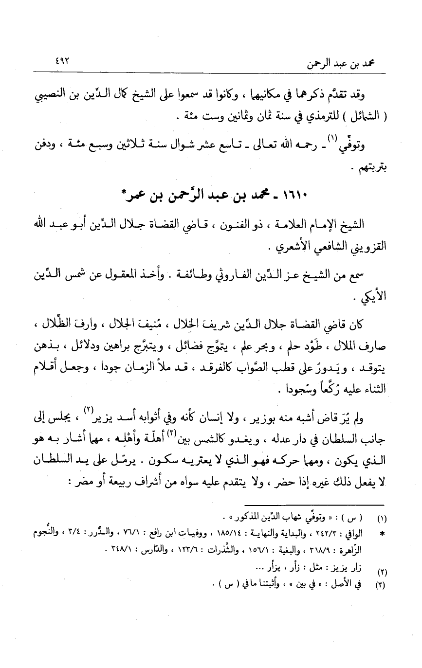 ولم ير قاض أشبه منه بوزير، ولا إنسان كأنه وفي أثوابه أسد يزير، يجلس إلى جانب السلطان في دار عدله، ويغدو كالشمس بين أهلة وأهله، مهما أشار به هو الذي يكون، ومهما حركه فهو الذي لا يعتريه سكون. يرمل على يد السلطان لا يفعل ذلك غيره إذا حضر، ولا يتقدم عليه سواه من أشراف ربيعة أو مضر:
