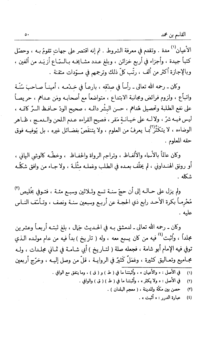 وكان - رحمه الله تعالى - رأساً في صدقه، بارعاً في خدمه، أميناً صاحب سنة واتباع، ولزوم فرائض ومجانبة الابتداع، متواصعاً مع أصحابه ومن عداهم، حريصاً على نفع الطلبة وتحصيل هداهم، حسن البشر دائمه، صحيح الود حافظ السر كاتمه، ليس فيه شر، ولا له على خيانة مقر، فصيح القراءة عدم اللحن والدمج، ظاهر الوضاءه، لا يتكثر بما يعرف من العلوم، ولا يتنقص بفضائل غيره، بل يوفيه فوق حقه المعلوم.