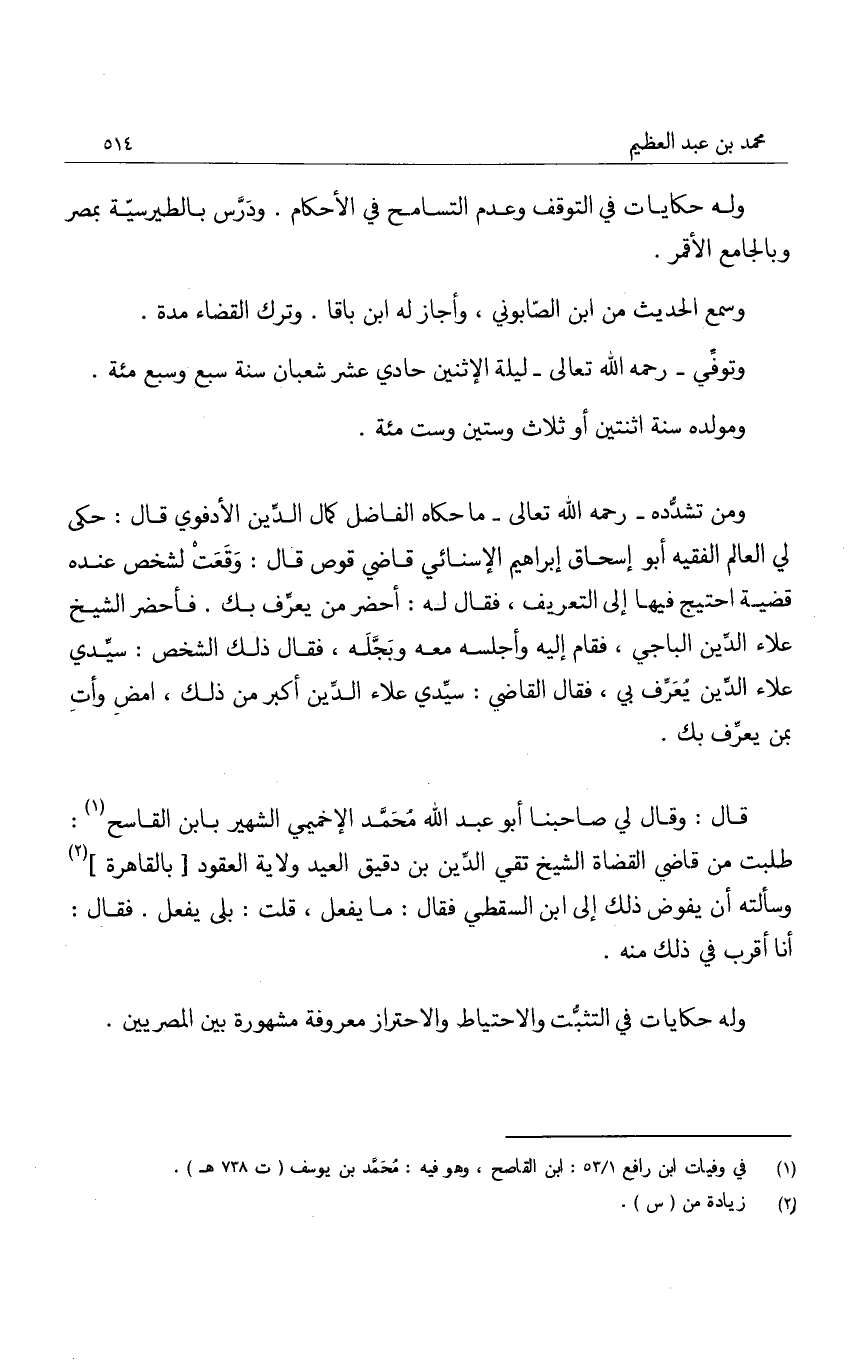 قال: وقال لي صاحبنا أبو عبد الله محمد الإخميمي الشهير بابن القاسح: طلبت من قاضي القضاة الشيخ تقي الدين بن دقيق العيد ولاية العقود بالقاهرة وسألته أن يفوض ذلك إلى ابن السقطي فقال: ما يفعل، قلت: بلى يفعل. فقال: أنا أقرب في ذلك منه.