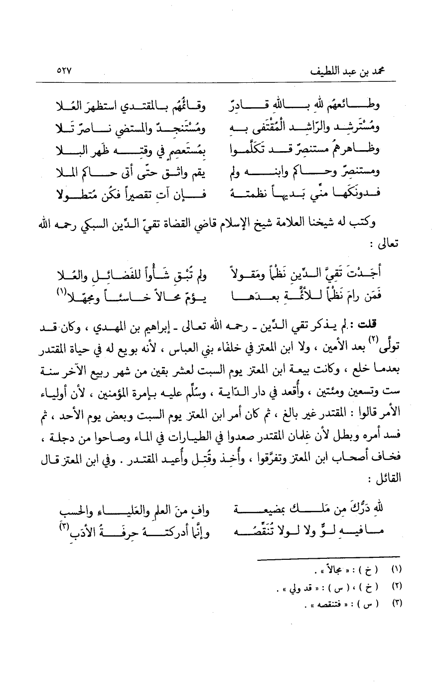 قلت: لم يذكر تقي الدين - رحمه الله تعالى - إبراهيم بن المهدي، وكان قد تولى بعد الأمين، ولا ابن المعتز في خلفاء بني العباس، لأنه بويع له في حياة المقتدر بعدما خلع، وكانت بيعة ابن المعتز يوم السبت لعشر بقين من شهر ربيع الآخر سنة ست وتسعين ومئتين، وأقعد في دار الداية، وسلم عليه بإمرة المؤمنين، لأن أولياء الأمر قالوا: المقتدر غير بالغ، ثم كان أمر ابن المعتز يوم السبت وبعض يوم الأحد، ثم فسد أمره وبطل لأن غلمان المقتدر صعدوا في الطيارات في الماء وصاحوا من دجلة، فخاف أصحاب ابن المعتز وتفرقوا، وأخذ وقتل وأعيد المقتدر. وفي ابن المعتز قال القائل: