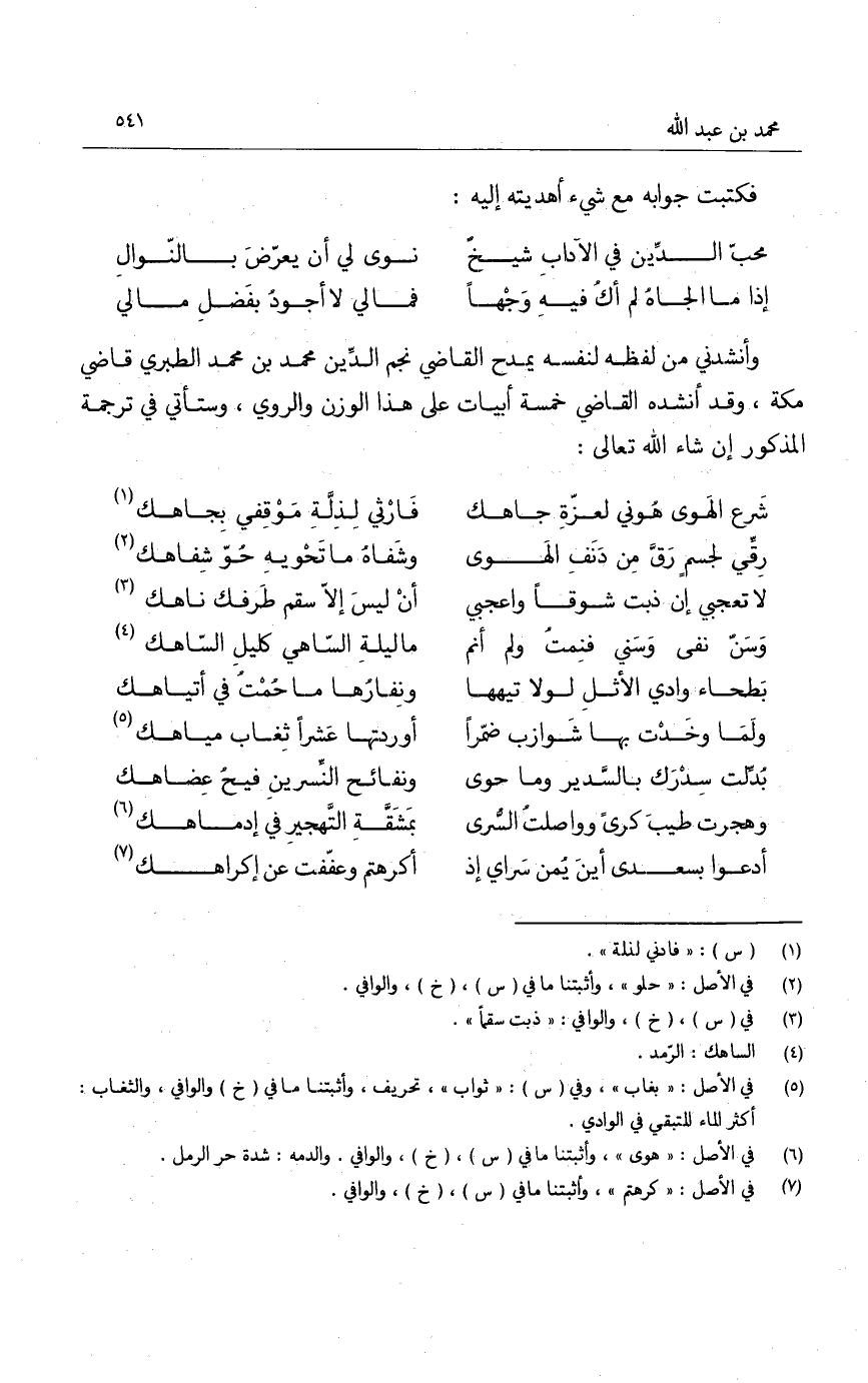 وأنشدني من لفظه لنفسه يمدح القاضي نجم الدين محمد بن محمد الطبري قاضي مكة، وقد أنشده القاضي خمسة أبيات على هذا الوزن والروي، وستأتي في ترجمة المذكور إن شاء الله تعالى:
