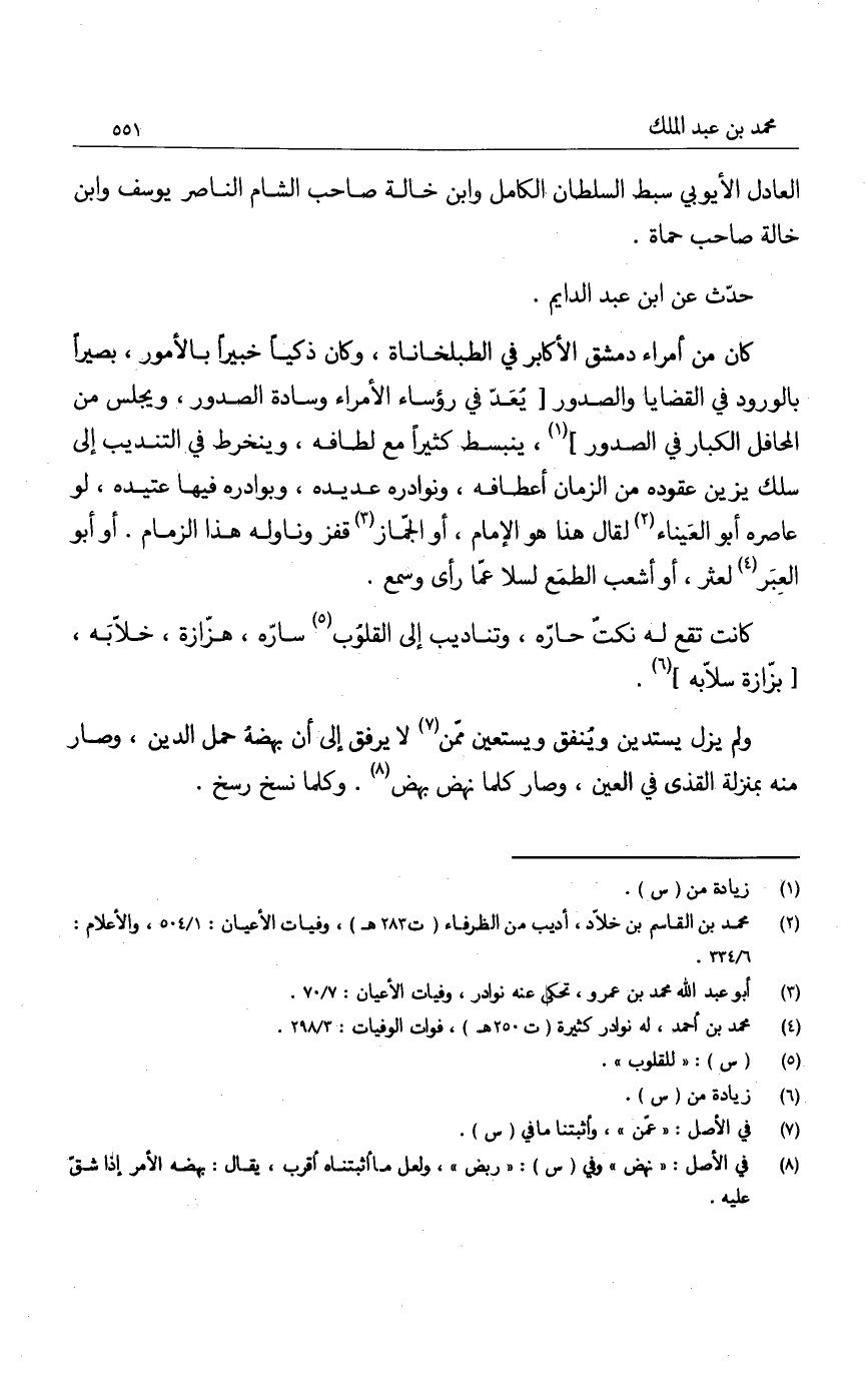 كان من أمراء دمشق الأكابر في الطبلخاناة، وكان ذكياً خبيراً، بصيراً بالورود في القضايا والصدور يعد في رؤساء الأمراء وسادة الصدور، ويجلس من المحافل الكبار في الصدور، ينبسط كثيراً مع لطافه، وينخرط في التنديب إلى سلك يزين عقوده من الزمان أعطافه، ونوادره عديده، وبوادره فيها عتيده، لو عاصره أبو العيناء لقال هذا هو الإمام، أو الجماز قفز وناوله هذا الزمام. أو أبو العبر لعثر، أو أشعب الطمع لسلا عما رأى وسمع.