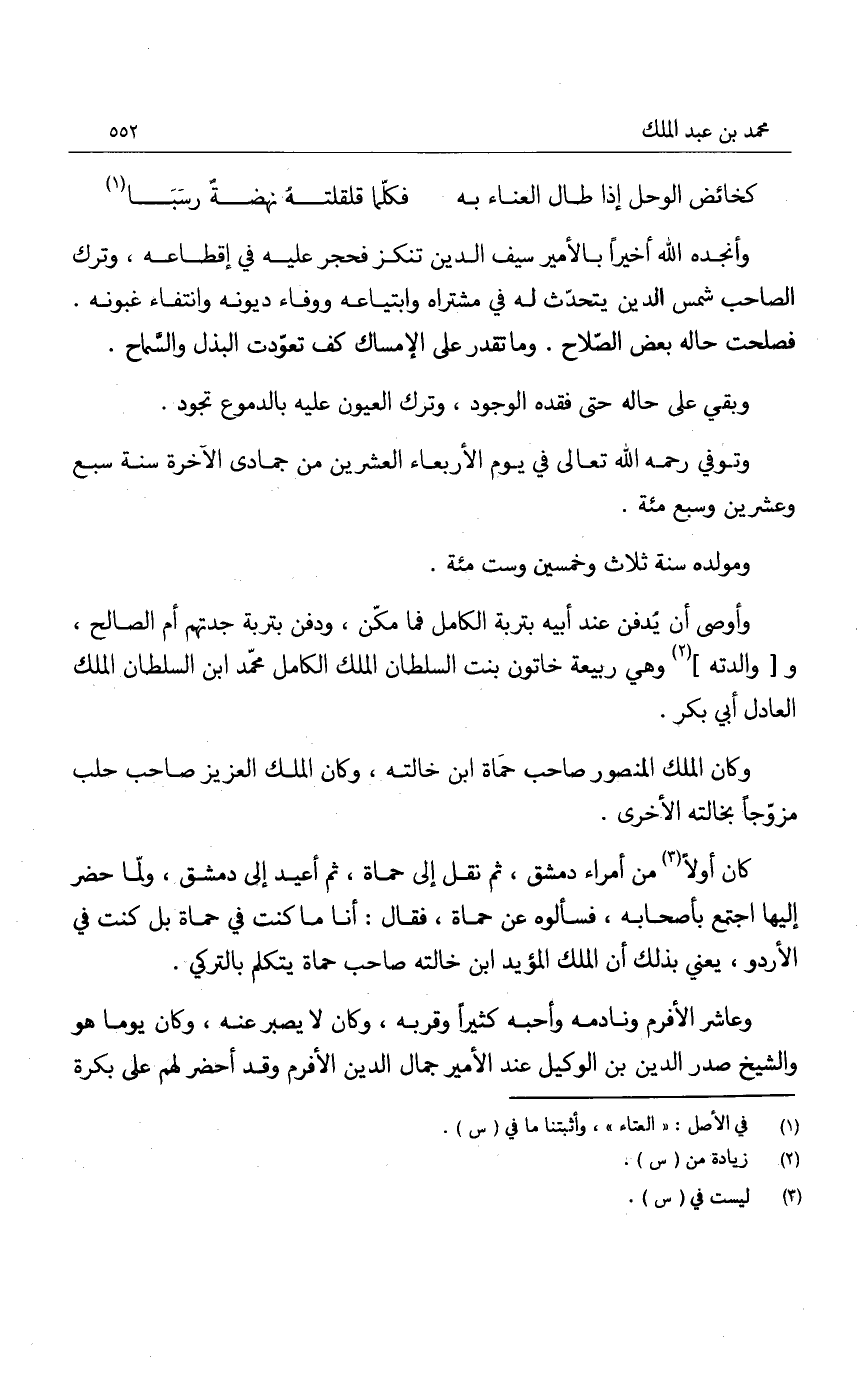 وأنجده الله أخيراً بالأمير سيف الدين تنكز فحجز عليه في إقطاعه، وترم الصاحب شمس الدين يتحدث له في مشتراه وابتياعه ووفاء ديونه وانتفاء غبونه. فصلحت حاله بعض الصلاح. وما تقدر على الإمساك كف تعودت البذل والسماح.