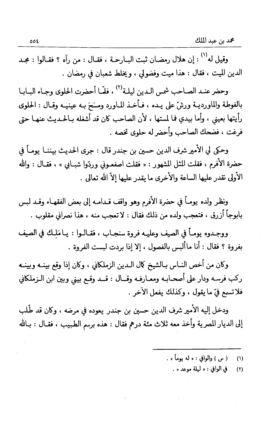 ودخل إليه الأمير شرف الدين حسين بن جندر يعوده في مرضه، وكان قد طلب إلى الديار المصرية وأخذ معه ثلاث مئة درهم فقال: هذه برسم الطبيب، فقال: بالله