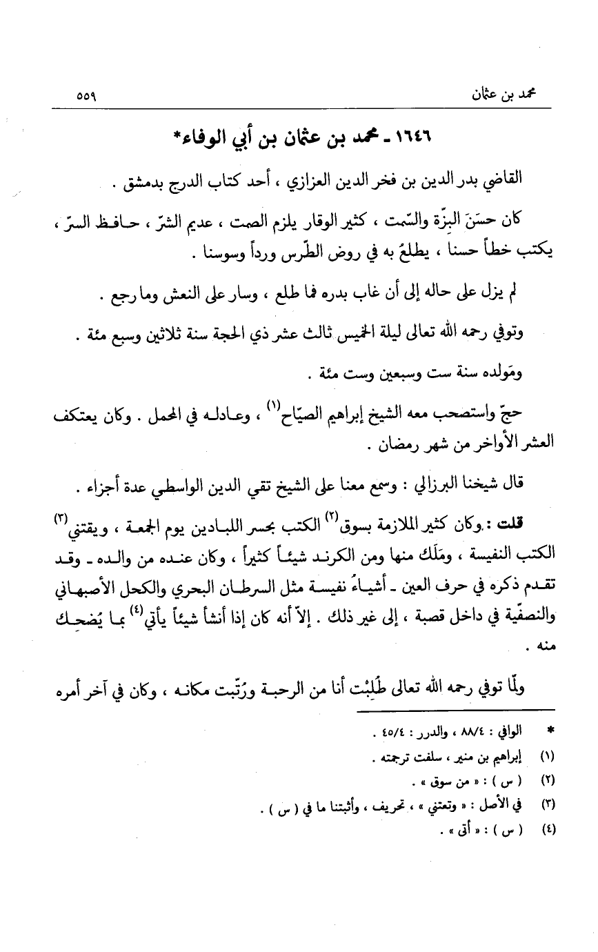 قلت: وكان كثير الملازمة بسوق الكتب بحسر اللبادين يوم الجمعة، ويقتني الكتب النفيسة، وملك منها ومن الكرند شيئاً كثيراً، وكان عنده من والده - وقد تقدم ذكره في حرف العين - أشياء نفيسة مثل السرطان البحري والكحل الأصبهاني والنصفية في داخل قصبة، إلى غير ذلك. إلا أنه كان إذا أنشأ شيئاً يأتي بما يضحك منه.