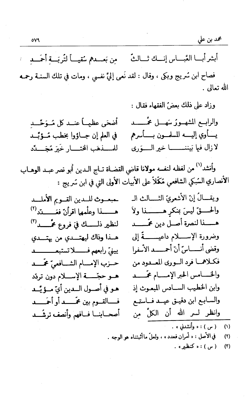 وأنشد من لفظه لنفسه مولانا قاضي القضاة تاج الدين أبو نصر عبد الوهاب الأنصاري السبكي الشافعي مكملاً على الأبيات الأولى التي في ابن سريج: