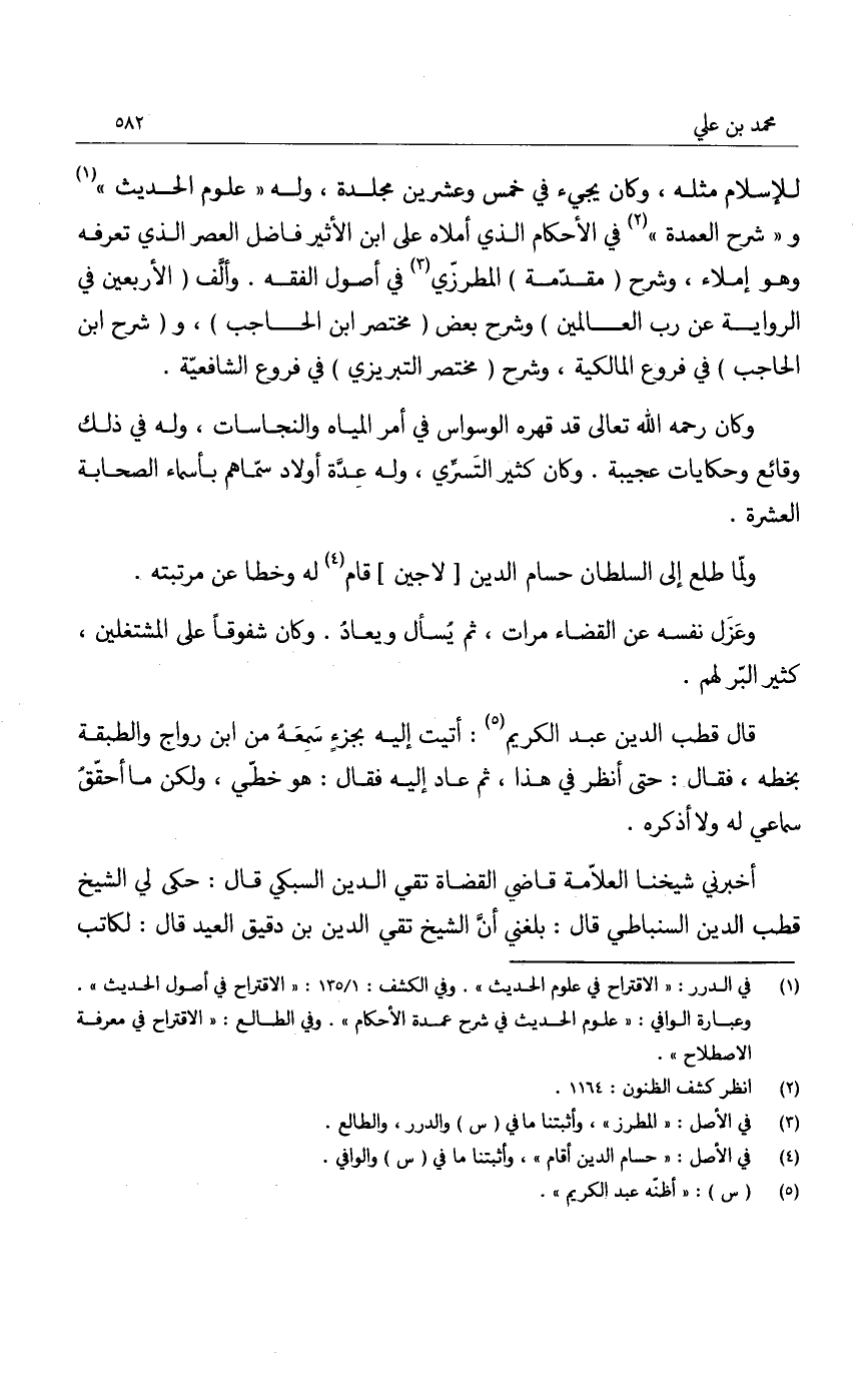 للإسلام مثله، وكان يجيء في خمس وعشرين مجلدة، وله " علوم الحديث " و" شرح العمدة " في الأحكام الذي أملاه على ابن الأثير فاضل العصر الذي تعرفه وهو إملاء، وشرح " مقدمة " المطرزي في أصول الفقه. وألف " الأربعين في الرواية عن رب العالمين " وشرح بعض " مختصر ابن الحاجب "، و" شرح ابن الحاجب " في فروع المالكية، وشرح " مختصر التبريزي " في فروع الشافعية.