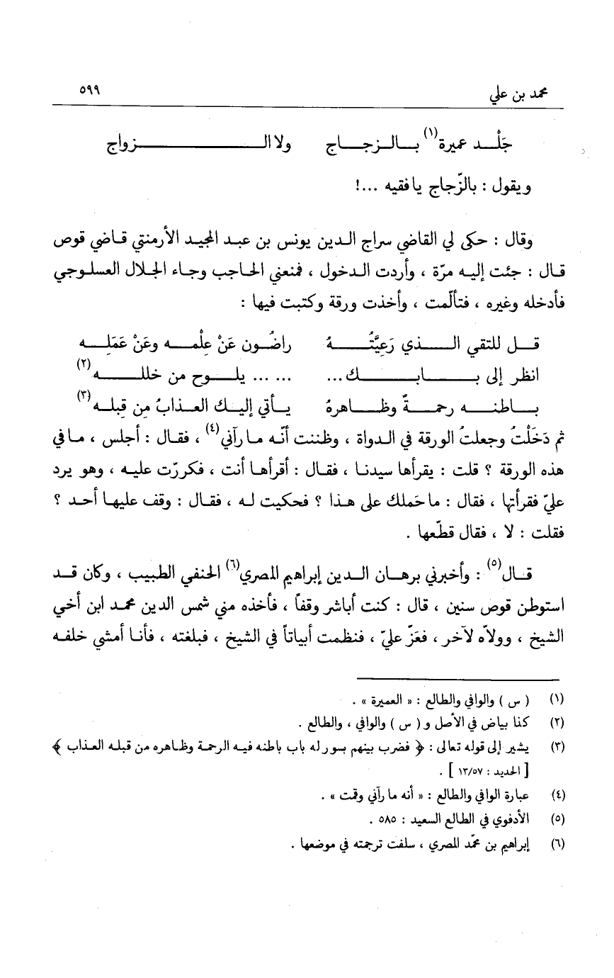 قال: وأخبرني برهان الدين إبراهيم المصري الحنفي الطبيب، وكان قد استوطن قوص سنين، قال: كنت أباشر وقفاً، فأخذه مني شمس الدين محمد ابن أخي الشيخ، وولاه لآخر، فعز علي، فنظمت أبياتاً في الشيخ، فبلغته، فأنا أمشي خلفه