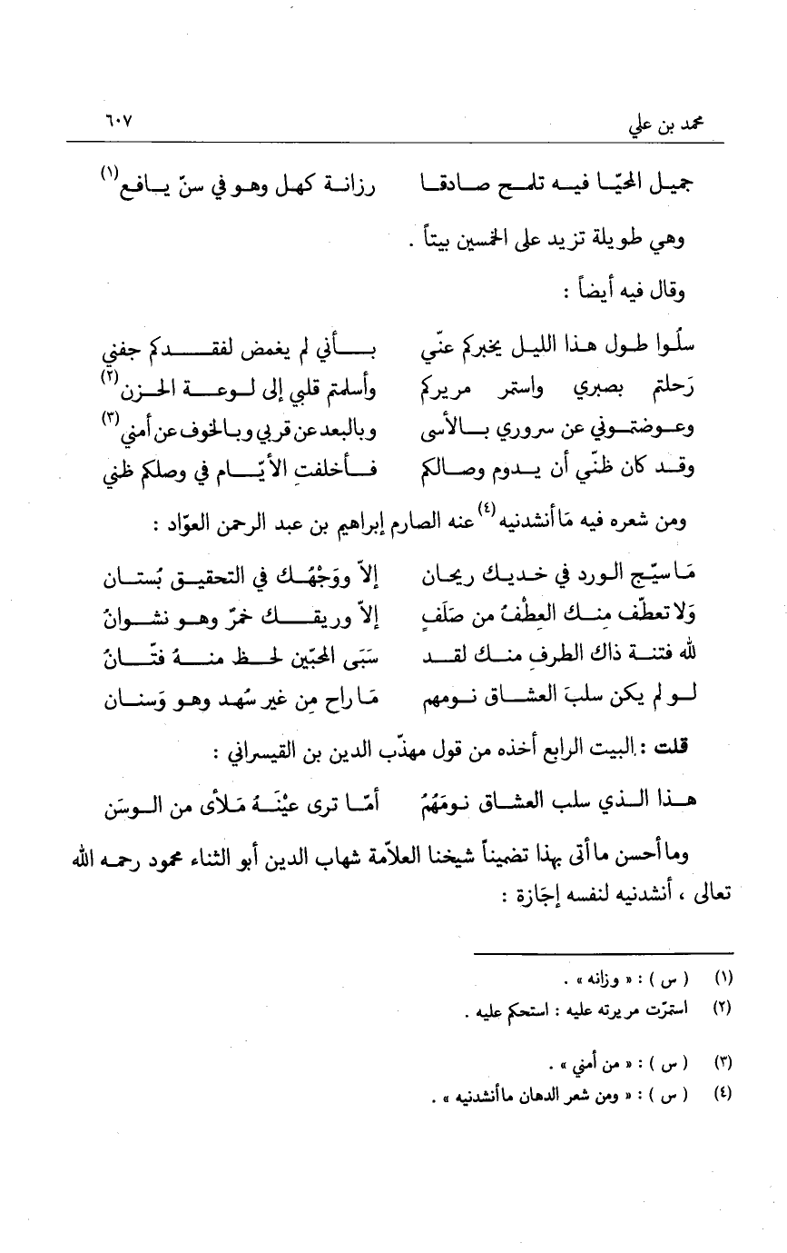 وما أحسن ما أتى بهذا تضميناً شيخنا العلامة شهاب الدين أبو الثناء محمود رحمه الله تعالى، أنشدنيه لنفسه إجازة: