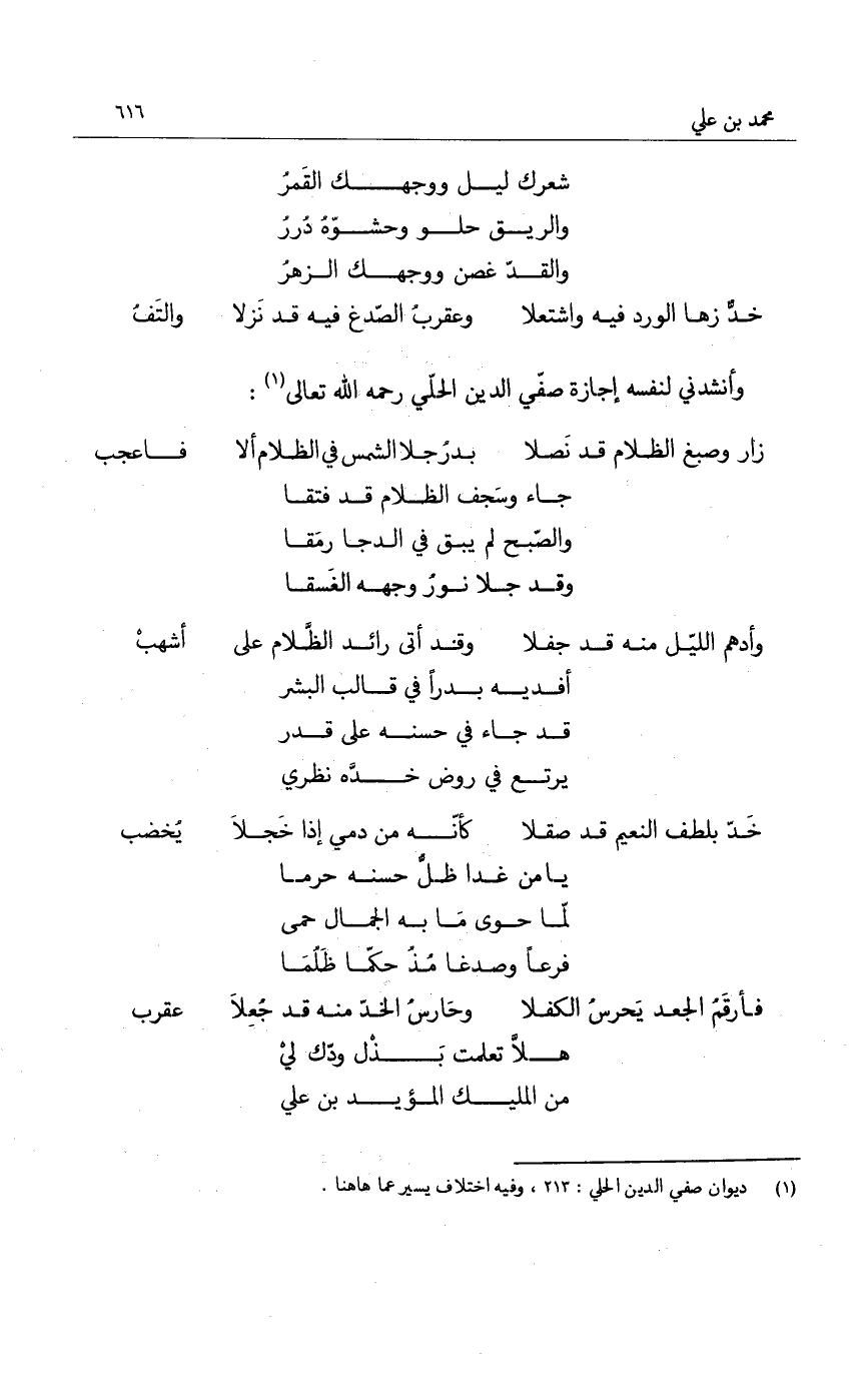 وأنشدني لنفسه إجازة صفي الدين الحلي رحمه الله تعالى: