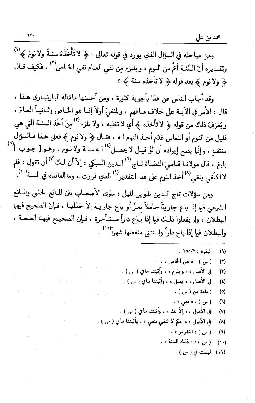 ومن مباحثه في السؤال الذي يورد في قوله تعالى: " لا تأخذه سنة ولا نوم " وتقديره أن السنة أعم من النوم، ويلزم من نفي العام نفي الخاص، فكيف قال " ولا نوم " بعد قوله " لا تأخذه سنة "؟ وقد أجاب الناس على هذا بأجوبة كثيرة، ومن أحسنها ما قاله البارنباري هذا، قال: الأمر في الآية على خلاف ما فهم، والمنفي أولاً إنما هو الخاص وثانياً العام ويعرف ذلك من قوله " لا تأخذه " أي لا تغلبه، ولا يلزم من أخذ السنة التي هي قليل من النوم أو النعاس عدم أخذ النوم له، فقال " ولا نوم " فعلى هذا فالسؤال منتف، وإنما يصح إيراده أن لو قيل لا يحصل له سنة ولا نوم. وهو جواب بليغ، قال مولانا قاضي القضاة تاج الدين السبكي: إلا أن لك أن تقول: فلم لا اكتفي بنفي أخذ النوم على هذا التقدير الذي قررت، وما الفائدة في السنة.