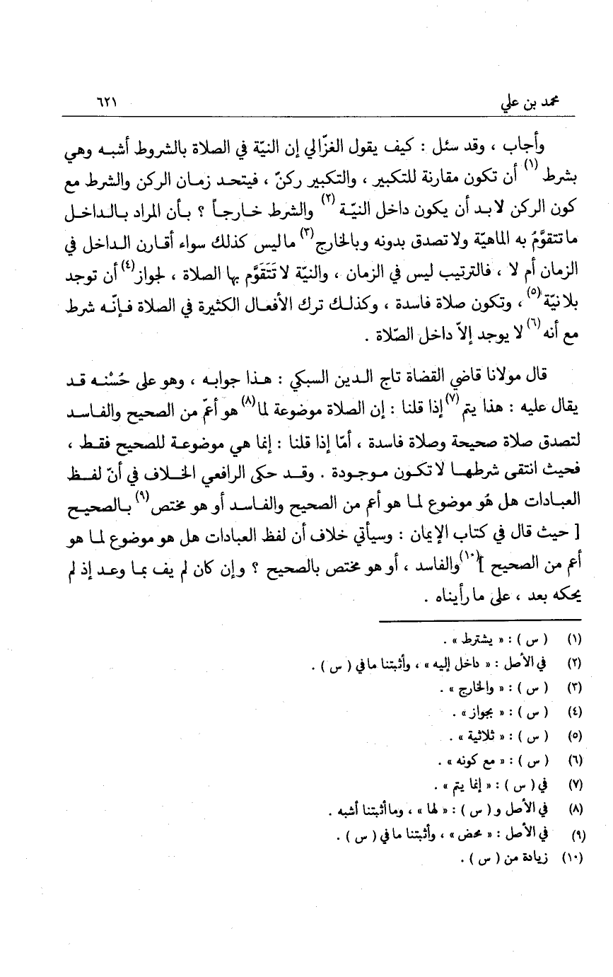 وأجاب، وقد سئل: كيف يقول الغزالي إن النية في الصلاة بالشروط أشبه وهي بشرط أن تكون مقارنة للتكبير، والتكبير ركن، فيتحد زمان الركن والشرط مع كون الركن لا بد أن يكون داخل النية والشرط خارجاً؟ بأن المراد بالداخل ما تتقوم به الماهية ولا تصدق بدونه وبالخارج ما ليس كذلك سواء أقارن الداخل في الزمان أم لا، فالترتيب ليس في الزمان، والنية لا تتقوم بها الصلاة، لجواز أن توجد بلا نية، وتكون صلاة فاسدة، وكذلك ترك الأفعال الكثيرة في الصلاة فإنه شرط مع أنه لا يوجد إلا داخل الصلاة.