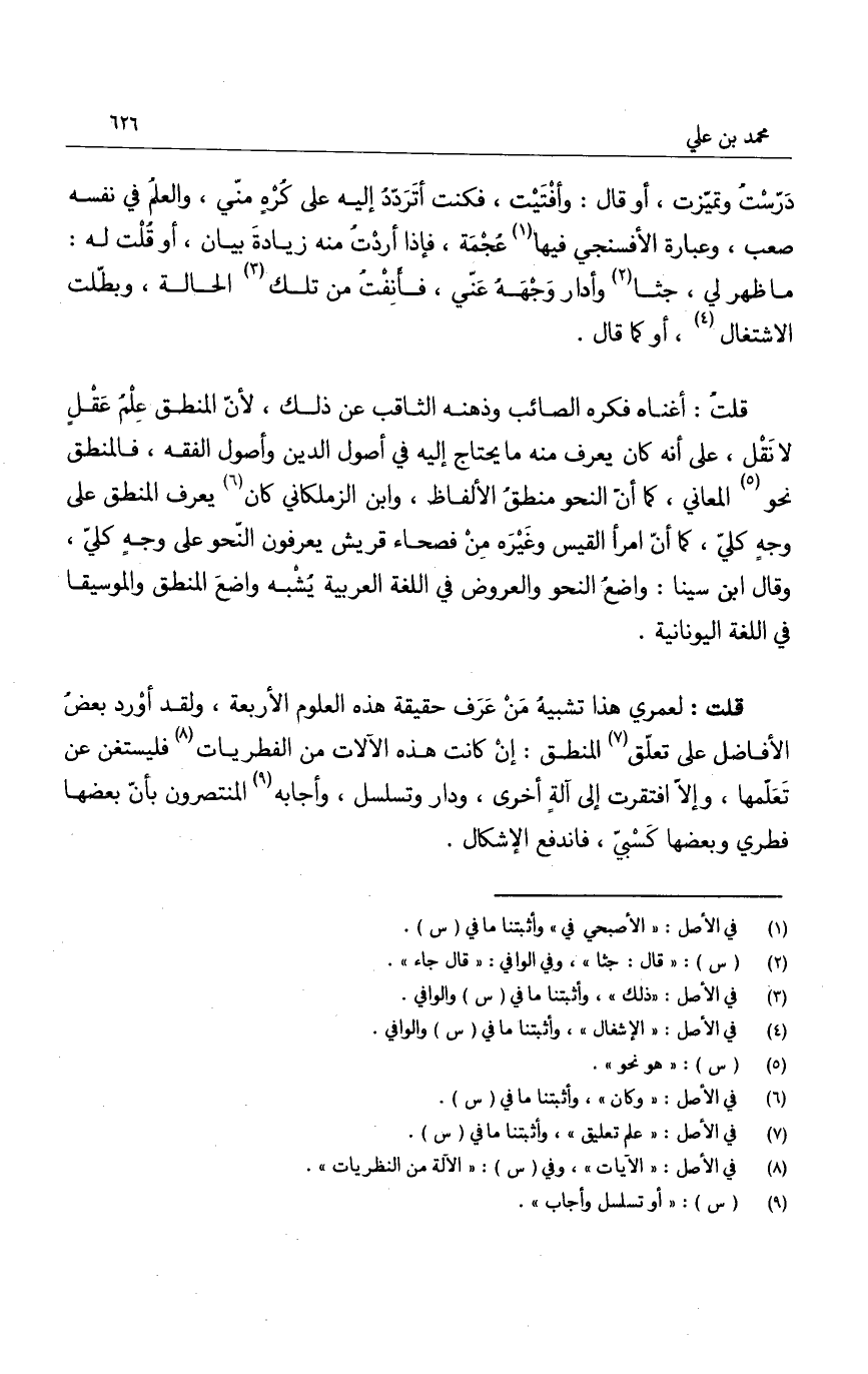 قلت: أغناه فكره الصائب وذهنه الثاقب عن ذلك، لأن المنطق علم عقل لا نقل، على أنه كان يعرف منه ما يحتاج إليه في أصول الدين وأصول الفقه، فالمنطق نحو المعاني، كما أن النحو منطق الألفاظ، وابن الزملكاني كان يعرف المنطق على وجه كلي، كما أن امرأ القيس وغيره من فصحاء قريش يعرفون النحو على وجه كلي، وقال ابن سينا: واضع النحو والعروض في اللغة العربية يشبه واضع المنطق والموسيقا في اللغة اليونانية.