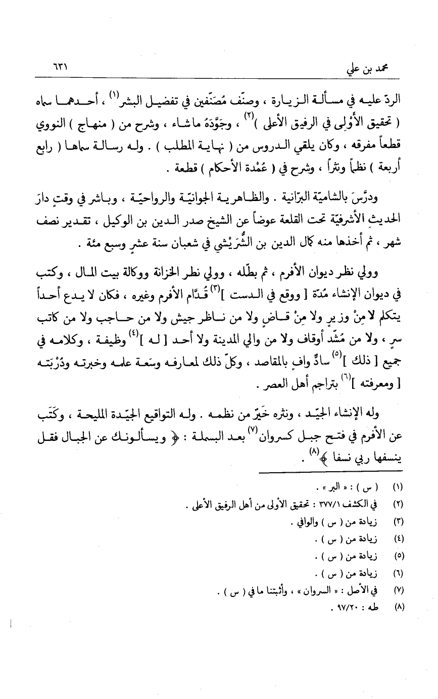 الرد عليه في مسألة الزيارة، وصنف مصنفين في تفضيل البشر، أحدهما سماه " تحقيق الأولى في الرفيق الأعلى "، وجوده ما شاء، وشرح من " منهاج " النووي قطعاً مفرقه، وكان يلقي الدروس من " نهاية المطلب ". وله رسالة سماها " رابع أربعة " نظماً ونثراً، وشرح في " عمدة الأحكام " قطعة.