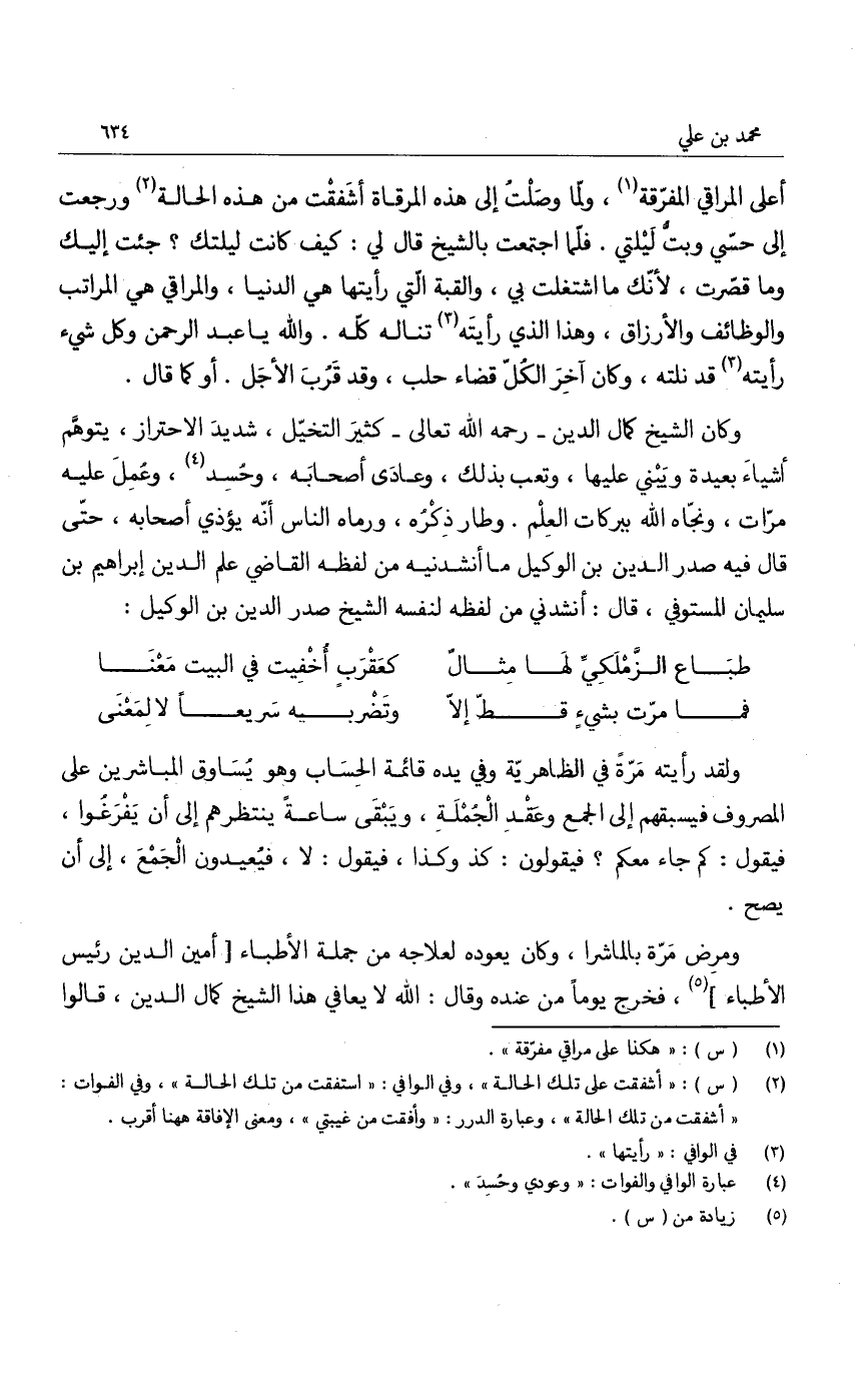 ومرض مرة بالماشرا، وكان يعوده لعلاجه من جملة الأطباء أمين الدين رئيس الأطباء، فخرج يوماً من عنده وقال: الله لا يعافي هذا الشيخ كمال الدين، قالوا