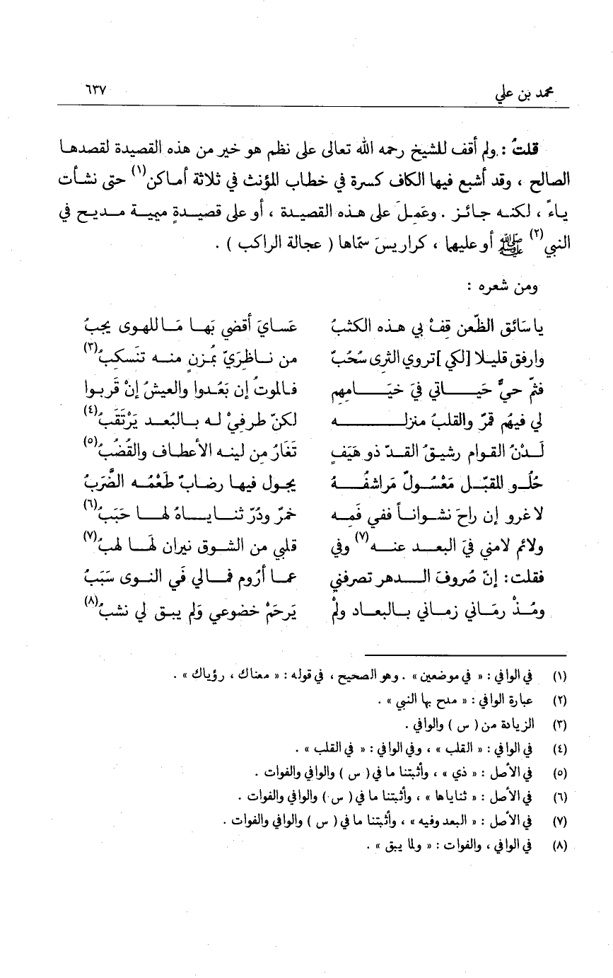 قلت: ولم أقف للشيخ رحمه الله تعالى على نظم هو خير من هذه القصيدة لقصدها الصالح، وقد أشبع فيها الكاف كسرة في خطاب المؤنث في ثلاثة أماكن حتى نشأت ياءً، لكنه جائز. وعمل على هذه القصيدة، أو على قصيدة ميمية مديح في النبي صَلَّى اللهُ عَلَيْهِ وَسَلَّمَ أو عليهما، كراريس سماها " عجالة الراكب ".