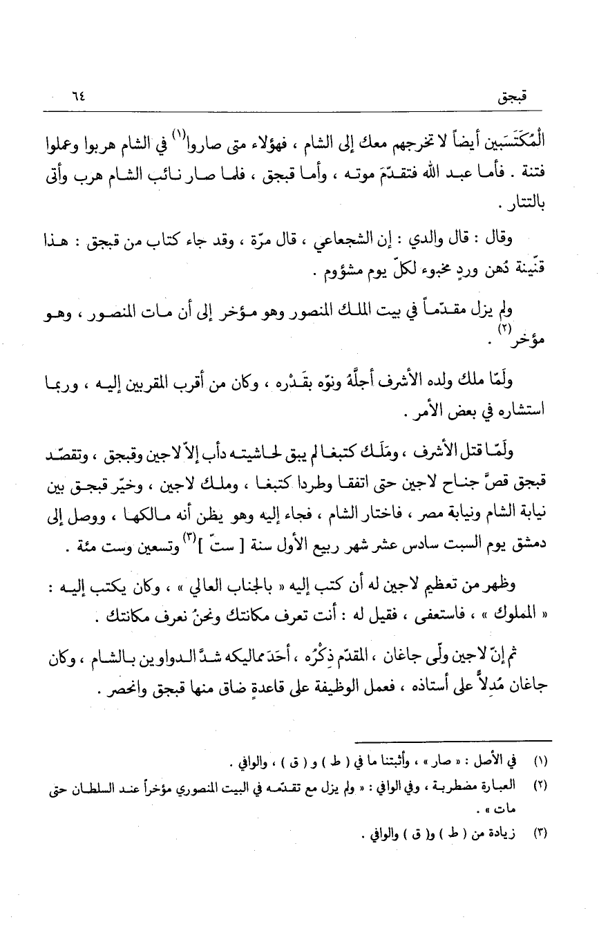 المكتسبين أيضاً لا تخرجهم معك إلى الشام، فهؤلاء متى صاروا في الشام هربوا وعملوا فتنة. فأما عبد الله فتقدم موته، وأما قبجق، فلما صار نائب الشام هرب وأتى بالتتار.