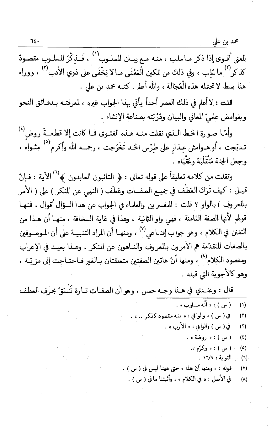 ونقلت من كلامه تعليقاً على قوله تعالى: " التائبون العابدون " الآية: فإن قيل: كيف ترك العطف في جميع الصفات وعطف " النهي عن المنكر " على " الأمر بالمعروف " بالواو؟ قلت: للمفسرين والعلماء في الجواب عن هذا السؤال أقول، فمنها قولهم لأنها الصفة الثامنة، فهي واو الثمانية، وهذا في غاية السخافة، منها أن هذا من التفنن في الكلام، وهو جواب إقناعي، ومنها أن المراد التنبيه على أن الموصوفين بالصفات المتقدمة هم الآمرون بالمعروف والناهون عن المنكر، وهذا بعيد في الإعراب ومقصود الكلام، ومنها أن هاتين الصفتين متعلقتان بالغير فاحتاجت إلى مزية، وهو كالأجوبة التي قبله.