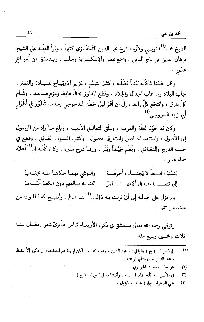 وكان حسناً شكله بيناً فضله، كثير التبسم، غزير الارتياح للسيادة والتسنم. جاب البلاد وما هاب الجدال والجلاد، وقطع المفاوز بحظ هابط وعزم صاعد. وشام كل بارق، وانتجع كل راعد، إلى أن أقمر ليل حظه الدجوجي بعدما تطور في أطوار أبي زيد السروجي.